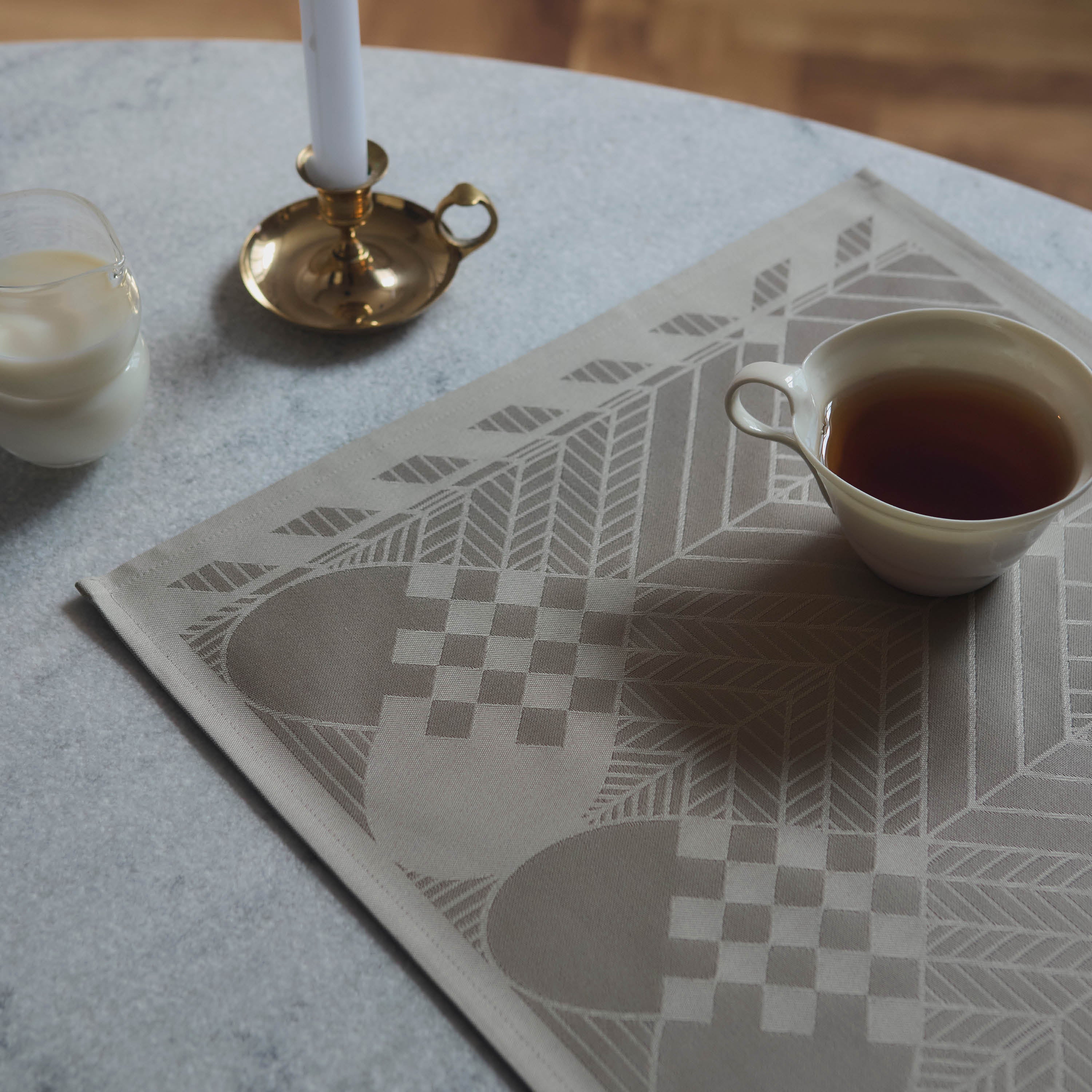 De kerstplacemat werd in 1975 ontworpen door textielkunstenaar Bodil Bødtker-Næss. Het suggestieve motief van delicaat gevlochten kersthartjes en gestileerde sparrentakken is een kenmerkend ontwerp geworden in de Georg Jensen Damask collectie.