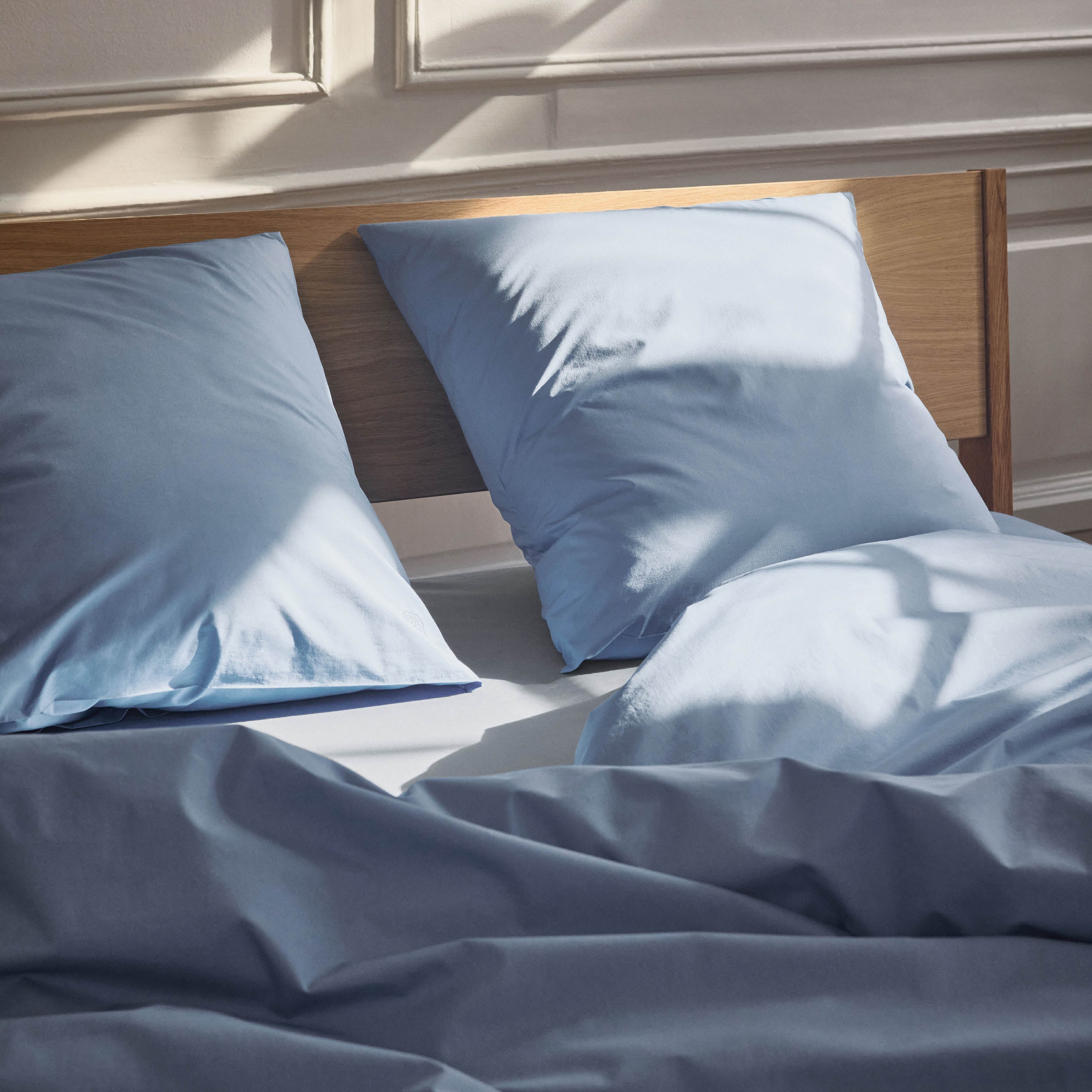 Met zijn fijne perkalbinding is het gelijknamige beddengoed knisperend zacht. De lichte en ademende kwaliteit van perkal ondersteunt een goede nachtrust. Het ontwerp is eenvoudig met een discreet geborduurd logo als enige detail. De kleur Blue Haze is een stoffige blauwe tint.