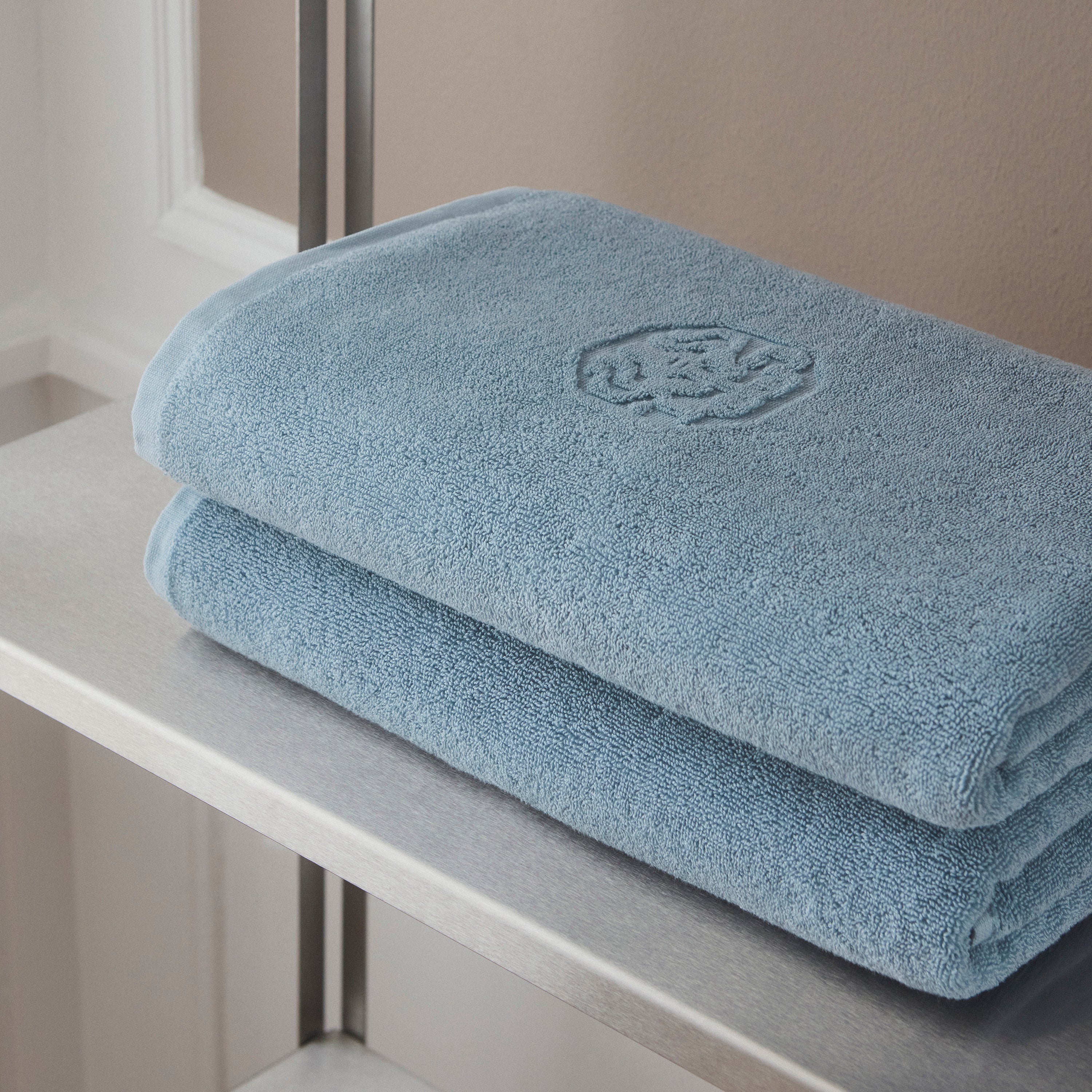 2 stuks grote en zachte Damask Terry badlakens in de kleur Blue Hour – een prachtige en tijdloze middentint blauw. Als elegant detail heeft het badlaken het iconische Georg Jensen Damask-logo, ingeweven in het ontwerp.