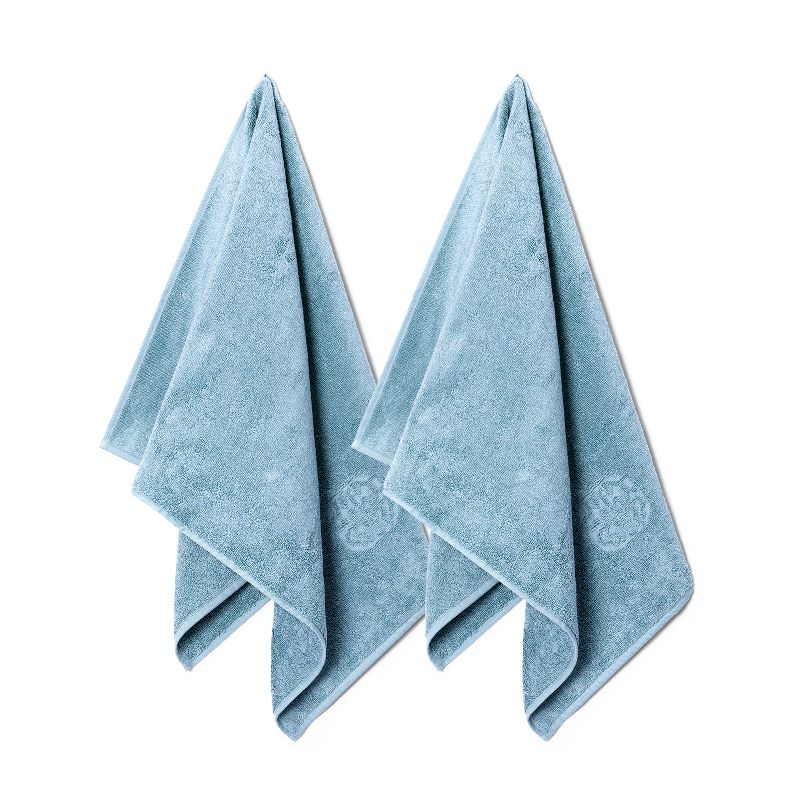 2 stuks Damask Terry handdoeken in de kleur Blue Hour – een prachtige en tijdloze middentint blauw. De handdoeken hebben een eenvoudig design met het iconische Georg Jensen Damask-logo, elegant ingeweven als detail.