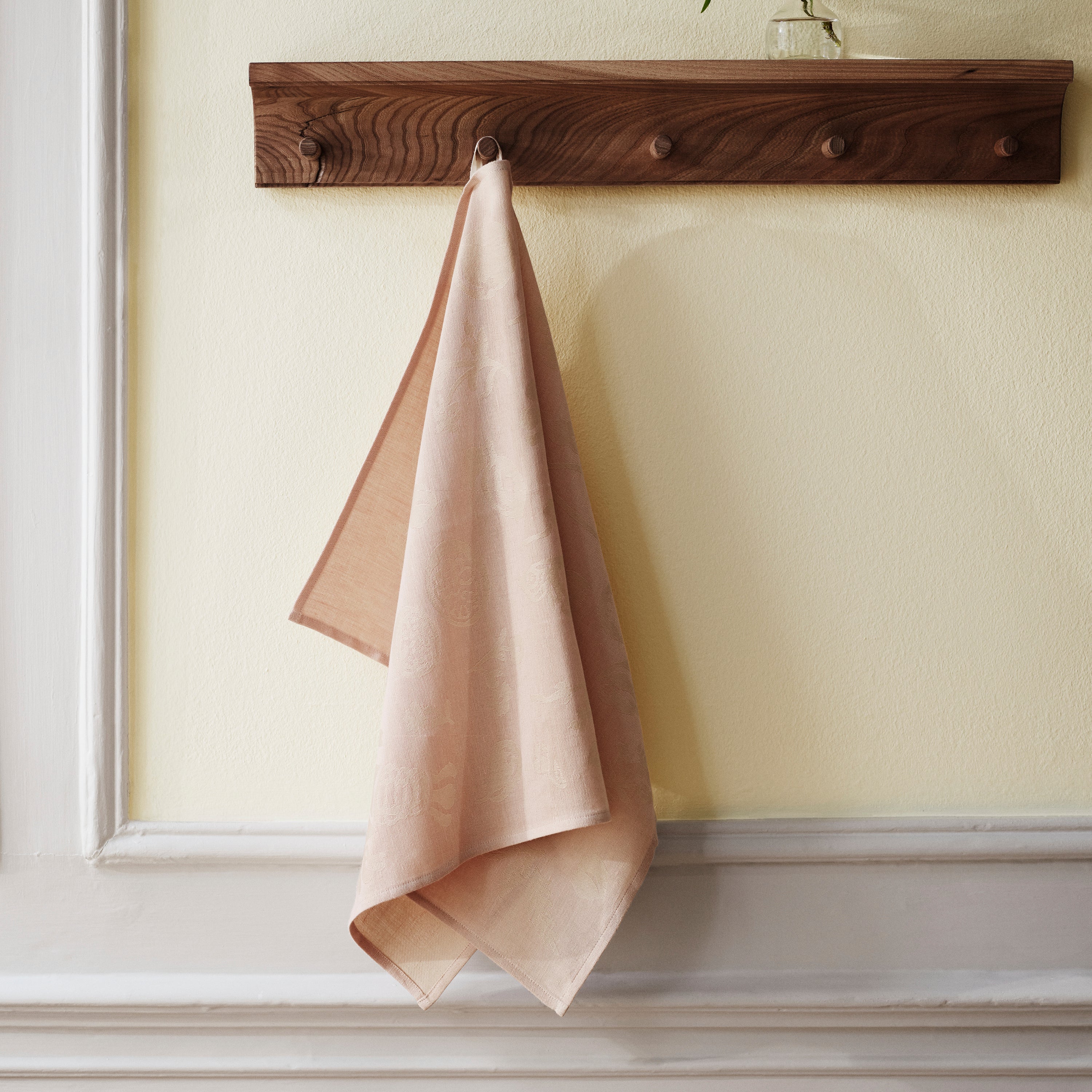 De Banquet theedoek is eenvoudig en elegant met ingeweven motieven ontleend aan de Renaissance maaltijd. De theedoek heeft een hoge droogcapaciteit, is damast geweven van 50% katoen en 50% linnen en is verkrijgbaar in kleuren zoals Soft Rose.