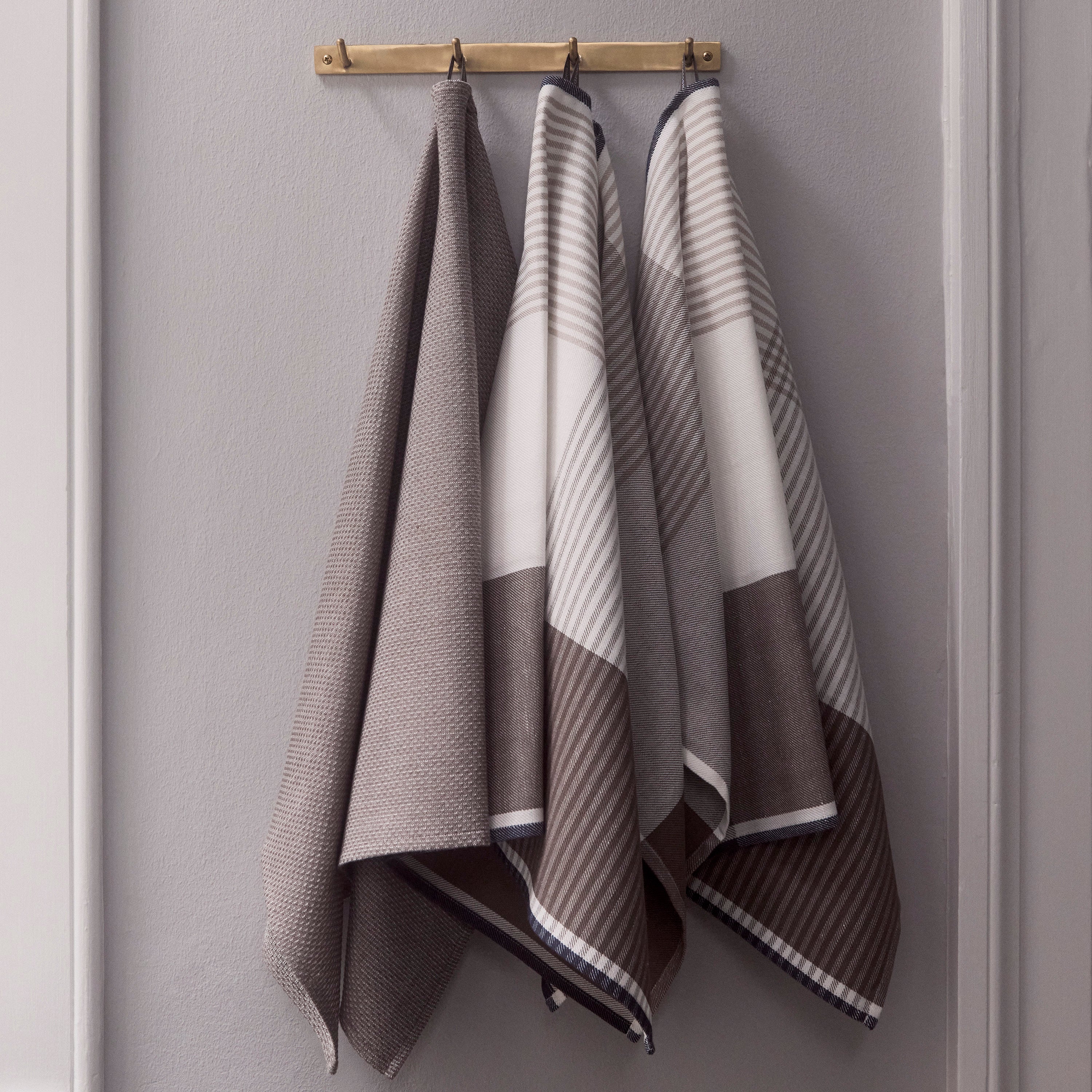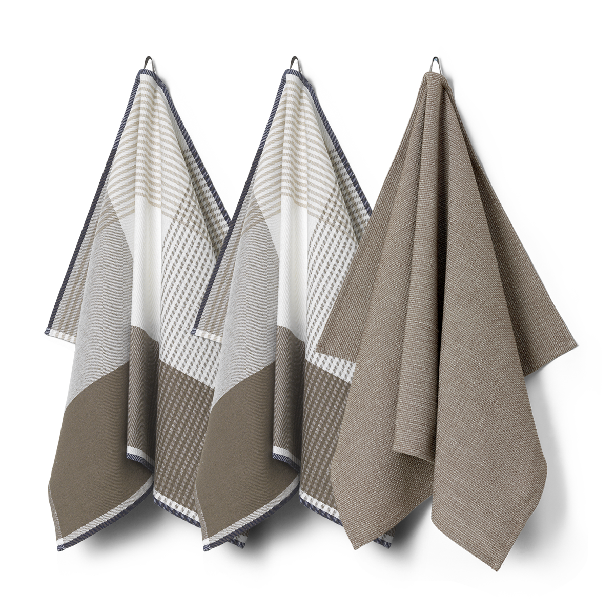 Keukenpakket met twee Becker 63 theedoeken en een 1959 keukendoek in de kleur Walnut – een donker notenbruine tint.