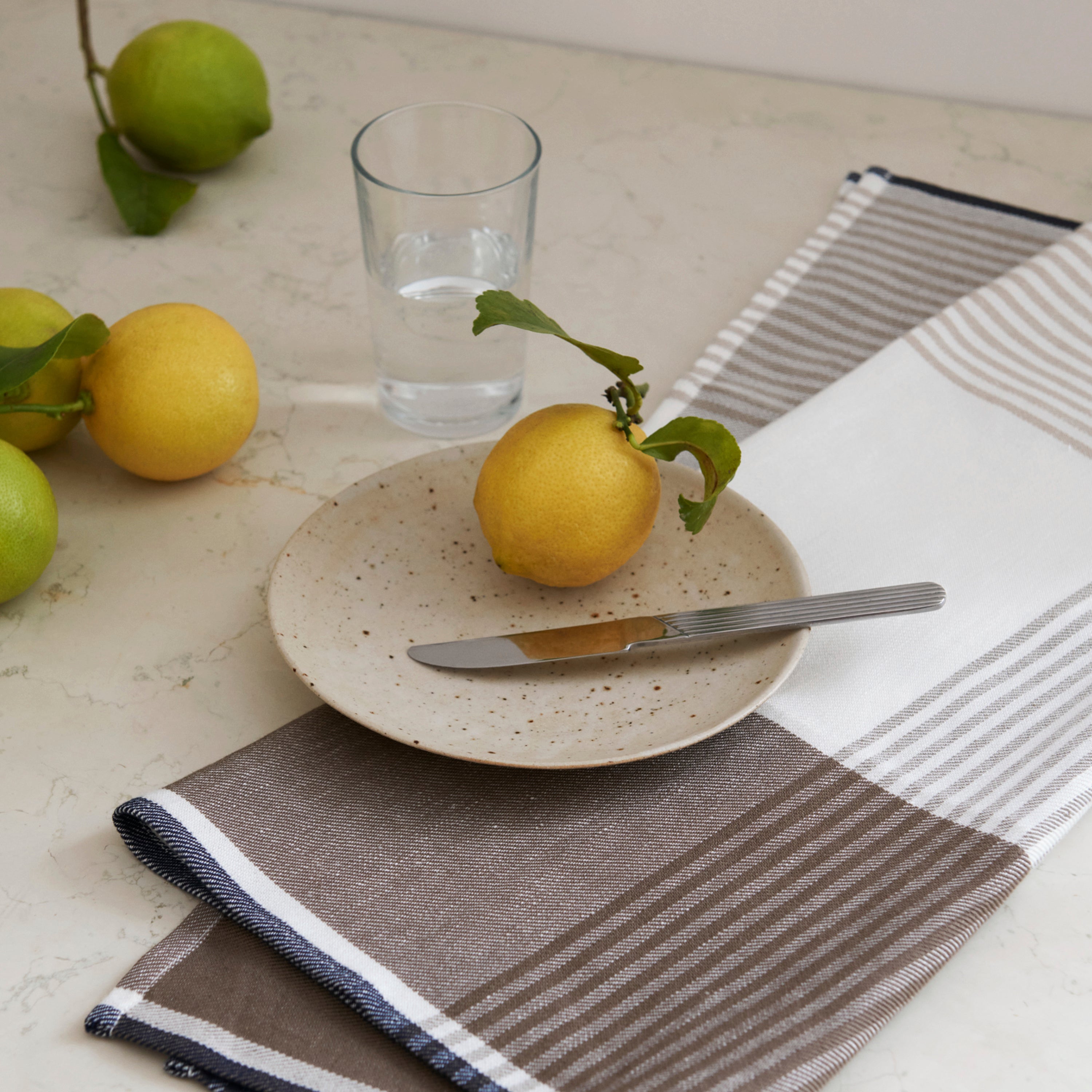 Een klassieke theedoek met een elegant grafisch patroon als belangrijkste designelement. Geweven in een sterke combinatie van linnen en katoen voor optimale droogeigenschappen.