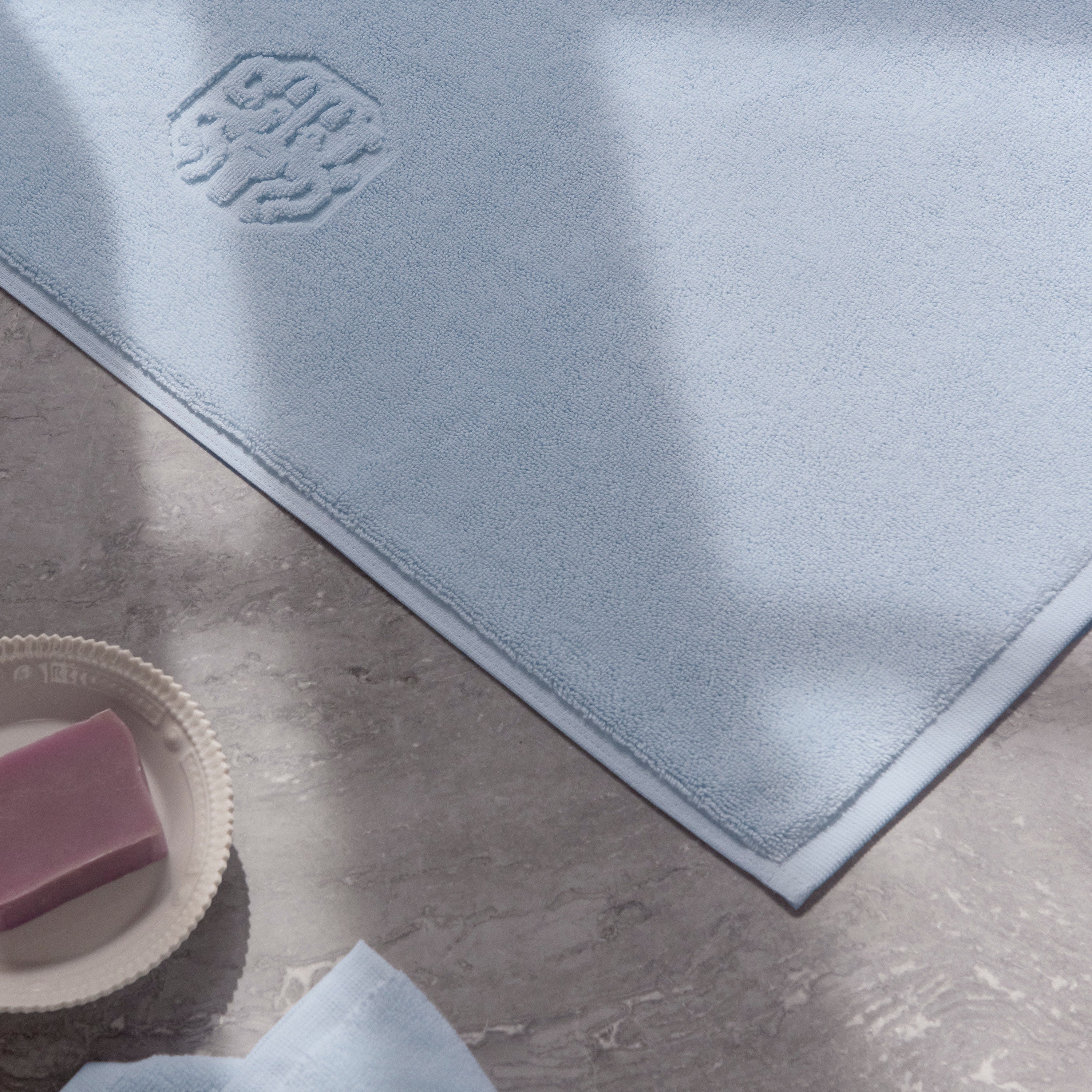 De Damask Terry badmat heeft een eenvoudige uitstraling met het iconische logo van Georg Jensen Damask ingeweven als elegant detail. Minimal Blue is een zeer lichte versie van lichtblauw met een vleugje aqua.