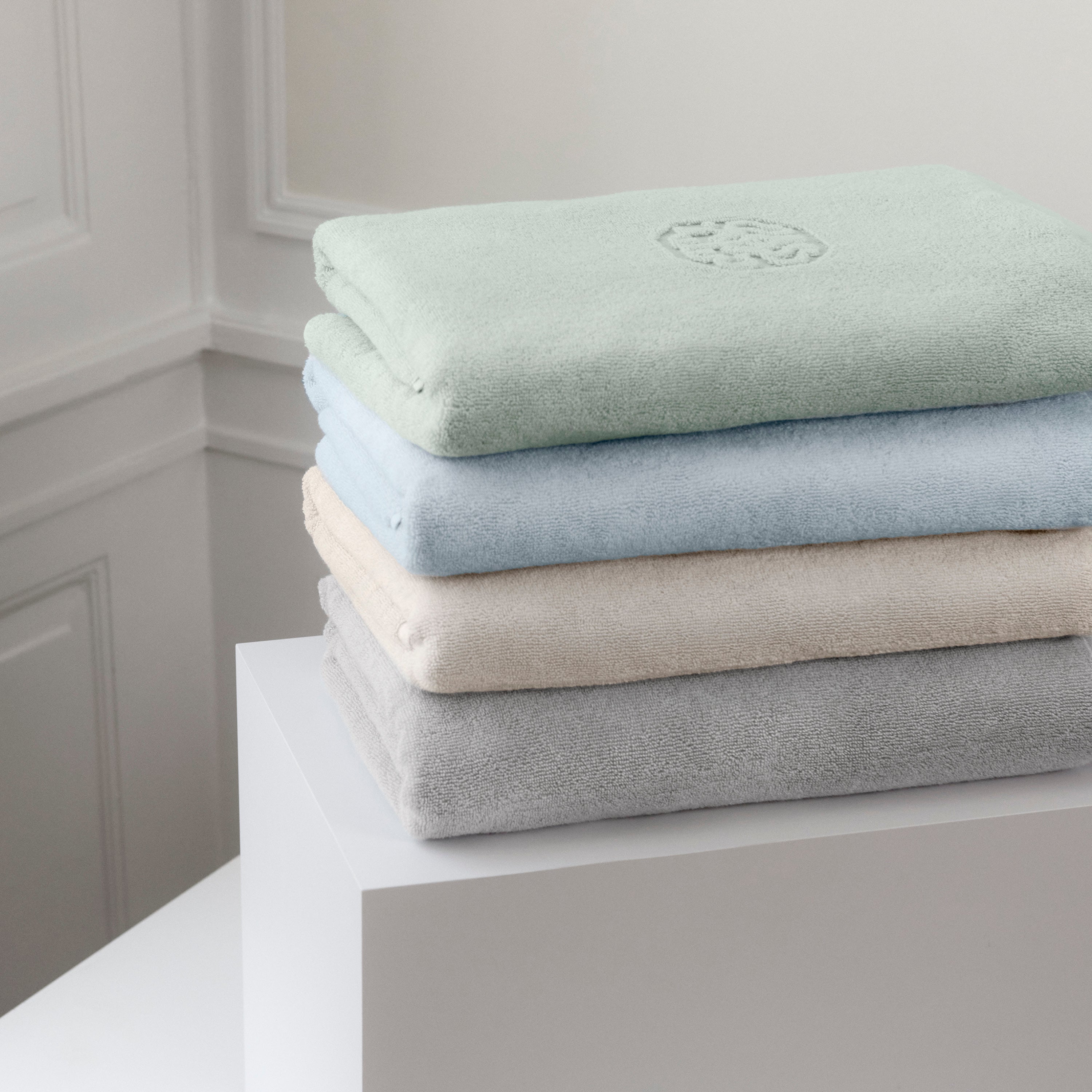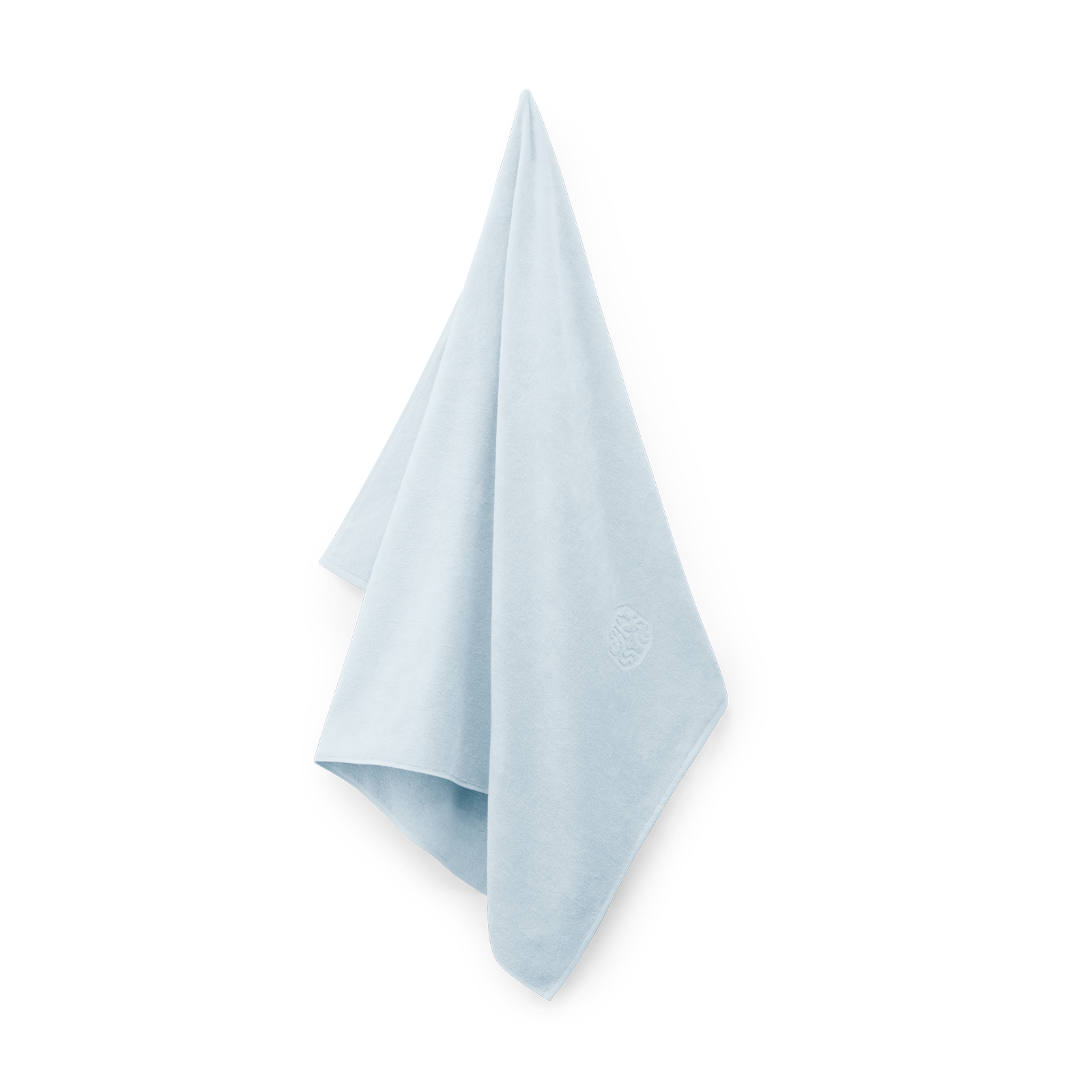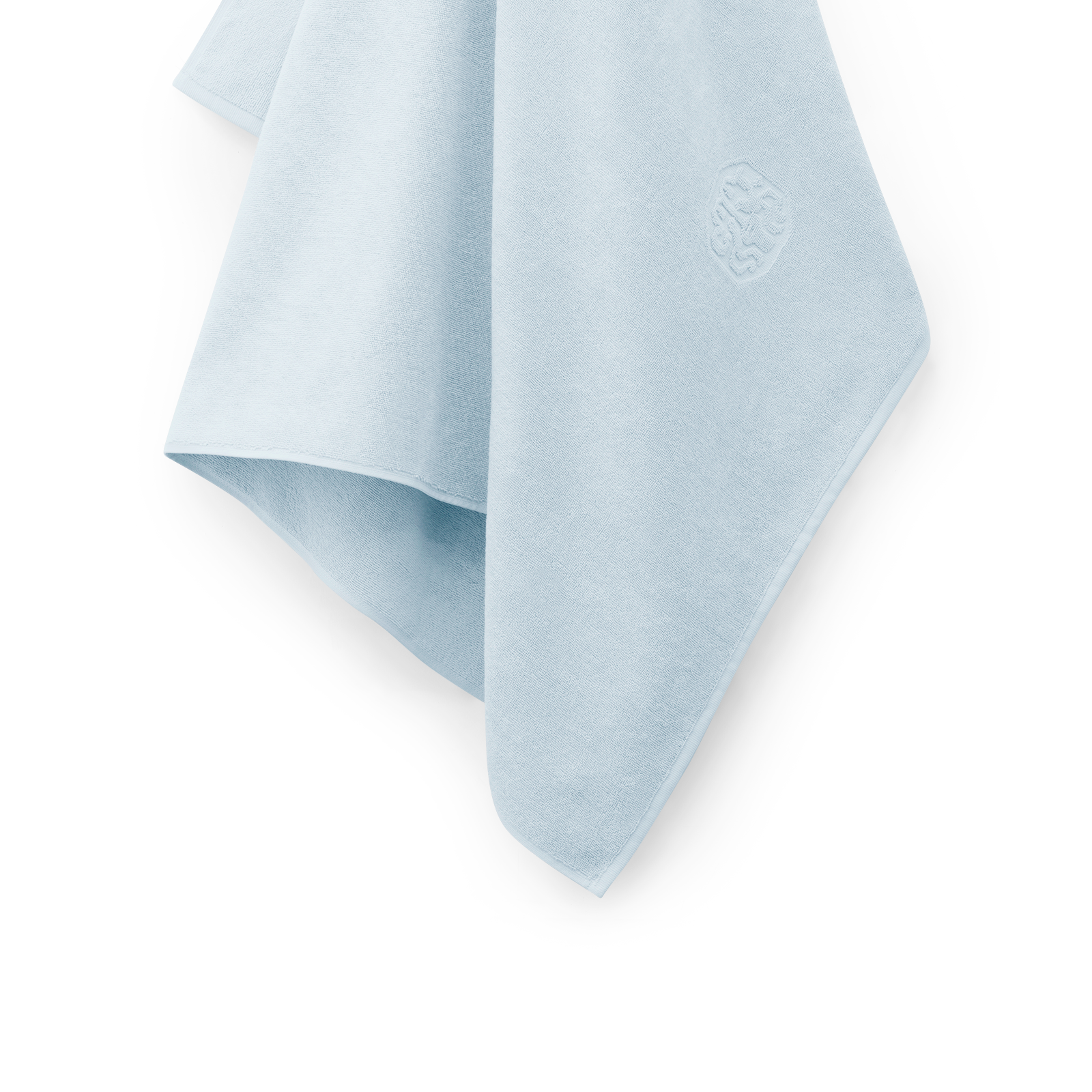 Groot en zacht badlaken van Damast Terry in een lichte, lichtblauwe kleur, Minimal Blue. Als elegant detail is het badlaken voorzien van het iconische logo van Georg Jensen Damask.