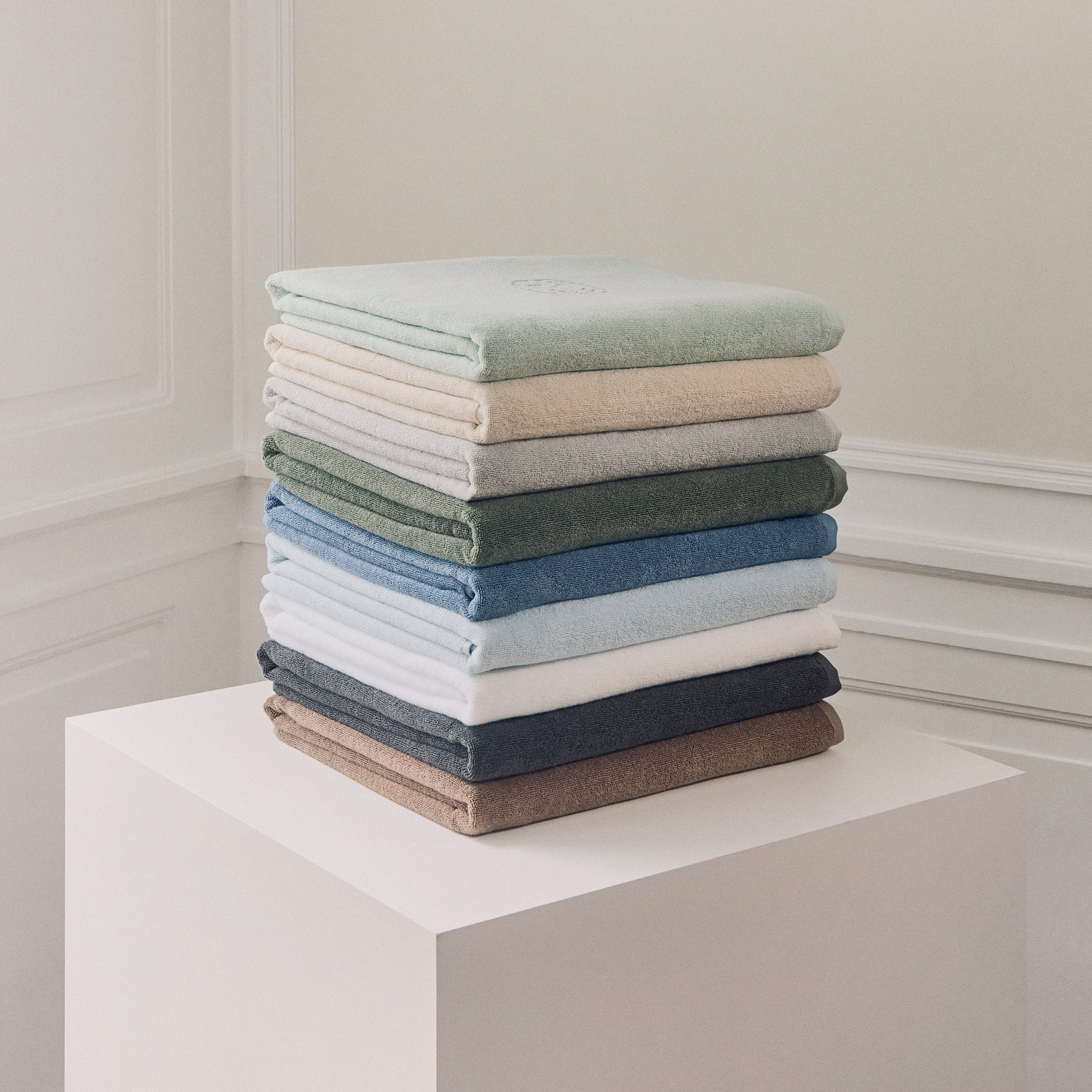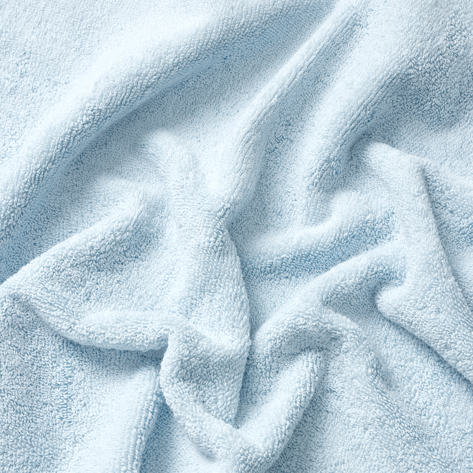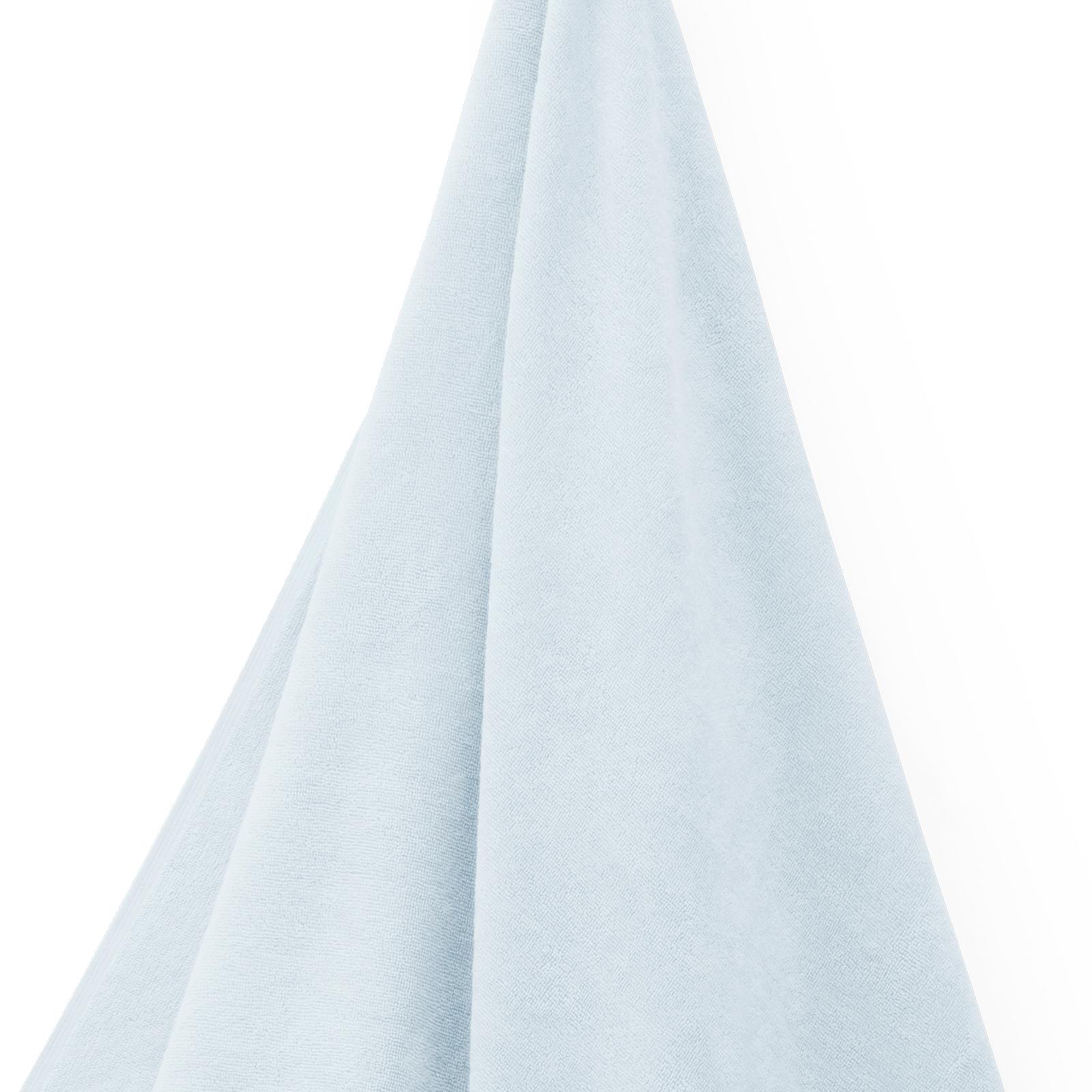 Groot en zacht badlaken van Damast Terry in een lichte, lichtblauwe kleur, Minimal Blue. Als elegant detail is het badlaken voorzien van het iconische logo van Georg Jensen Damask.