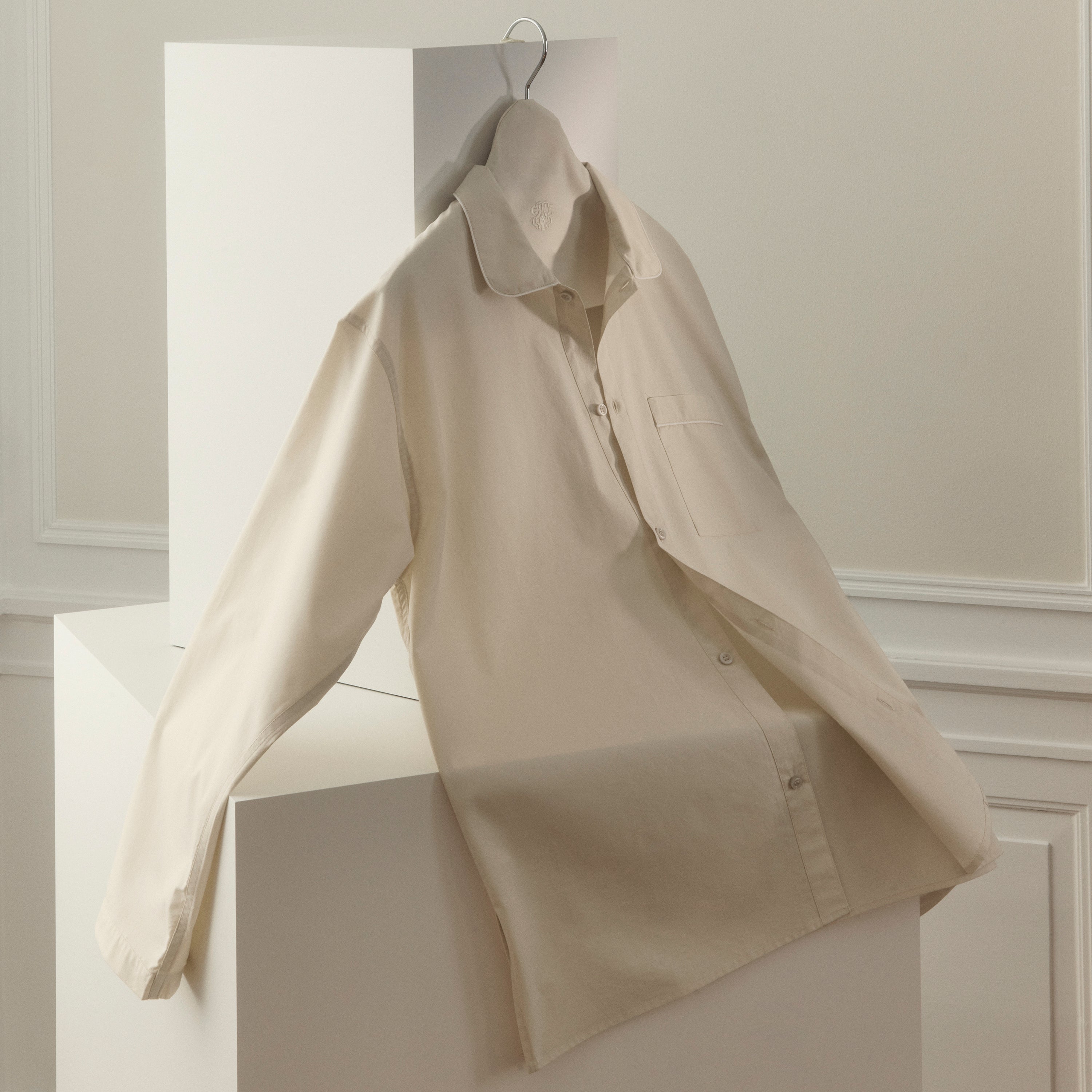 Percalegeweven pyjama met een klassieke snit en elegante details, zoals zijsplitjes, borstzak, afgeronde kraag en witte biezen.
