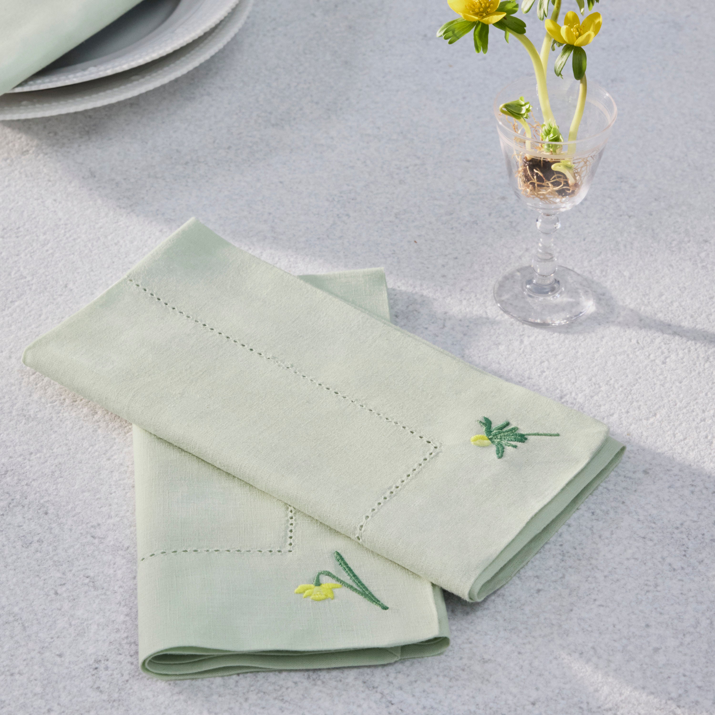 Narcissen, winterakonieten en anemonen. De nieuwe Spring servetten zijn geborduurd met motieven van de eerste bloemen van het voorjaar. Nu krijgt u 2 stuks tegen een lanceringsprijs.