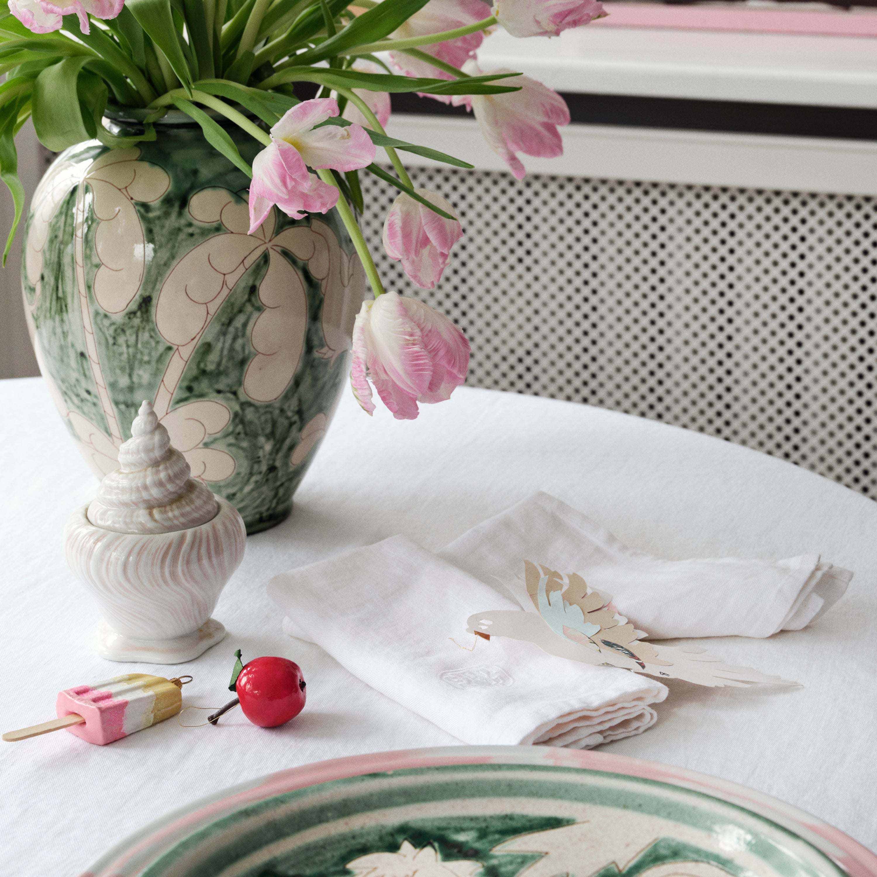 "In mijn familie hebben we iets met tafelkleden. Mooie tafelkleden voegen echt iets toe aan een tafel. In de zomer gebruik ik graag gekleurde tafelkleden, maar als het kerst is, moet het tafelkleed wit zijn, vind ik - de uitstraling moet niet te zwaar zijn. De witte kleur en de kaarsen in combinatie met meer kerstachtige elementen zorgen voor een mooi geheel. En ik vind het geborduurde logo op het linnen tafelkleed heel mooi," zegt ze.