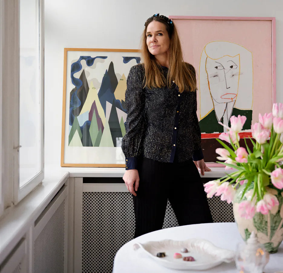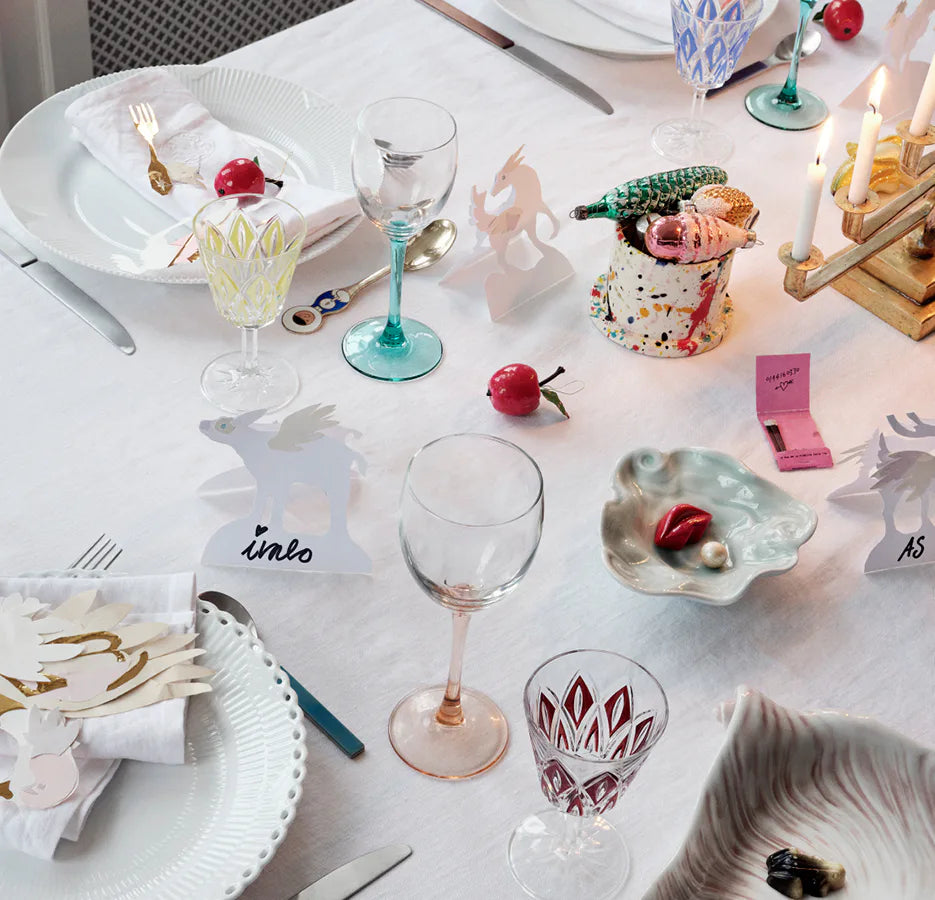 De lange tafel in haar woonkamer is gedekt met witte Royal Copenhagen borden, wat volgens As Øland "een beetje plechtstatigheid creëert". Er staan ook vintage wijnglazen in verschillende kleuren, geërfde voorwerpen en eigenzinnige kerstdecoraties die ze in de loop der tijd heeft verzameld.