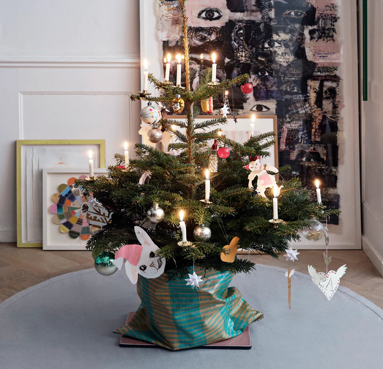 In de woonkamer naast de eettafel staat een klein mollig boompje op het ronde PLAIN kersttapijt. Øland heeft geen basis voor haar kerstboom, maar heeft hem in plaats daarvan in een kleurrijk net geplaatst. "Het voegt een beetje scherpte en brutaliteit toe aan alle traditionele dingen die Kerstmis te bieden heeft," zegt ze.