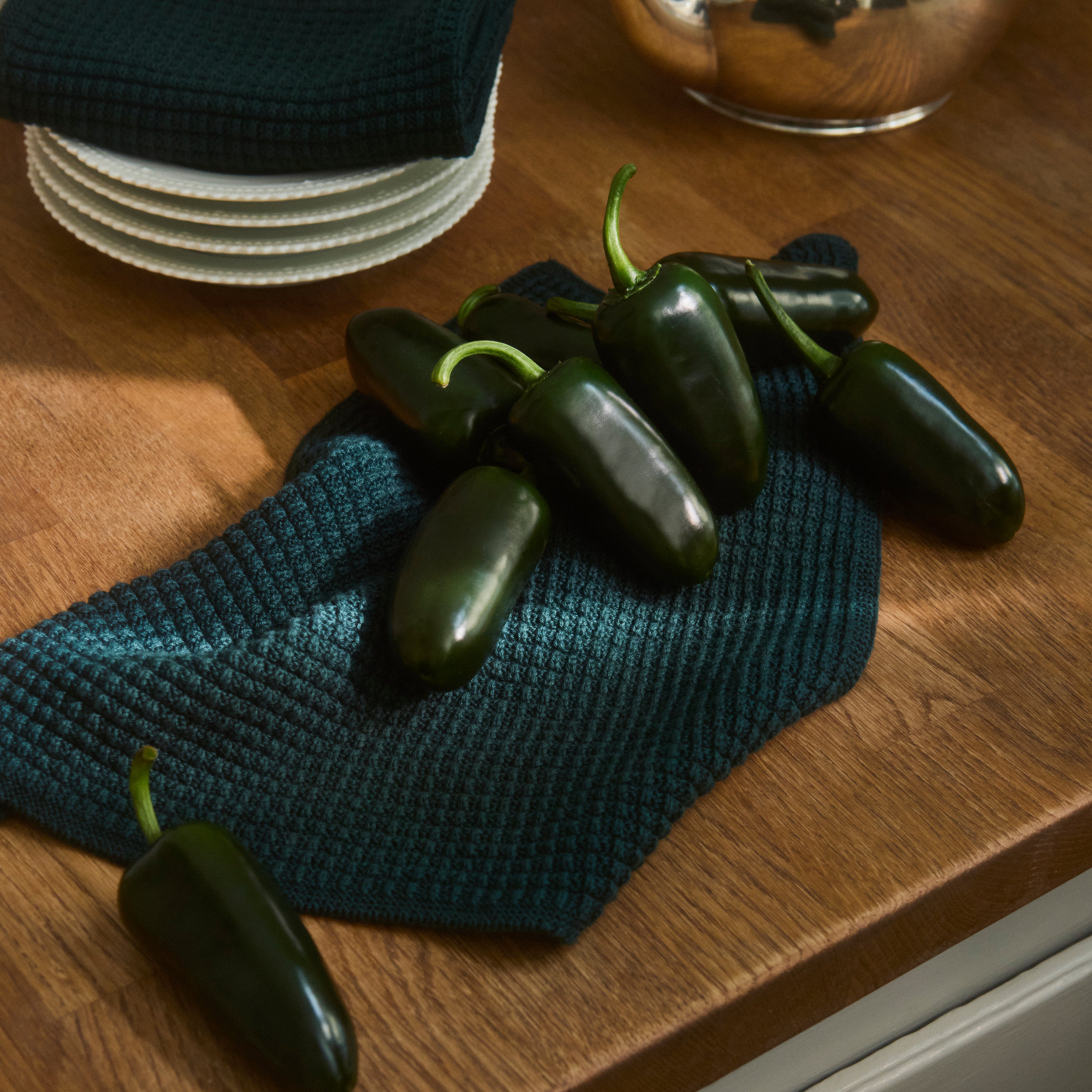 Strukturstrikket karklud i 100 % bomuld. Evergreen er en helt mørk og kølig grøn. Klassisk og sofistikeret.
