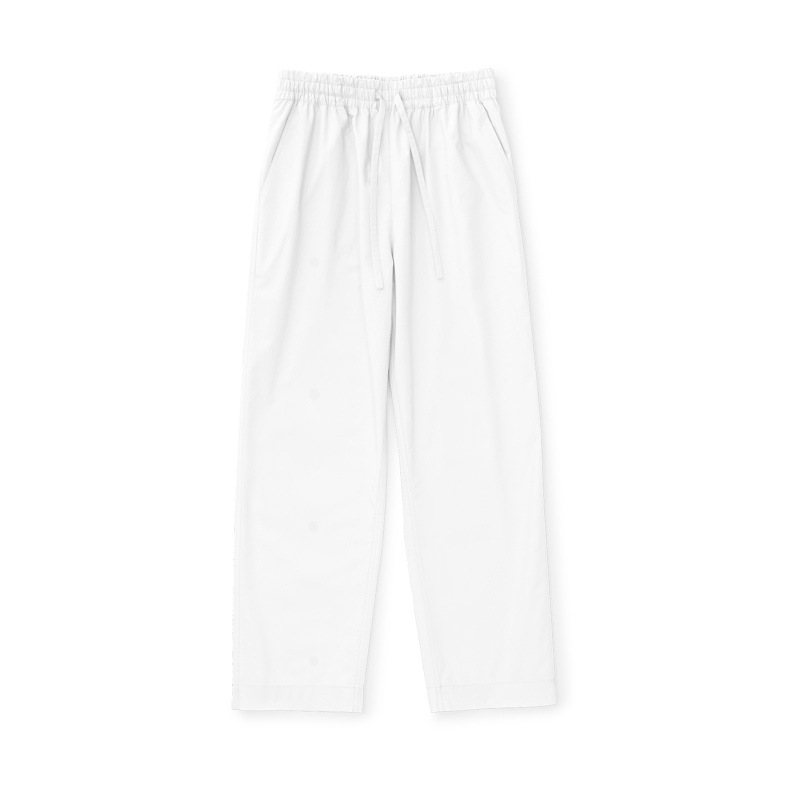 Unisex pyjamas percalevævet i supimabomuld. Pyjamassen har et klassisk snit og elegante, hvide pipings. Farven White er en helt ren hvid.