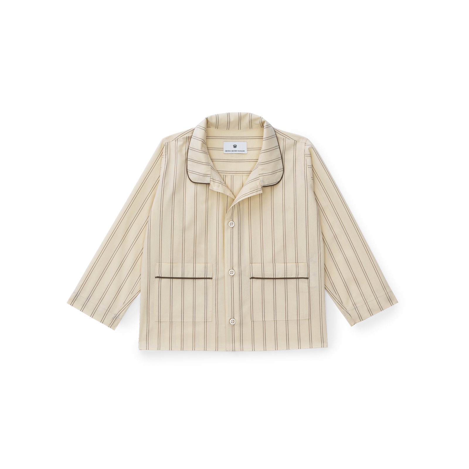 Skjorten har sideslidser, brystlomme, afrundet krave og Georg Jensen Damasks ikoniske logo broderet på bærestykket i nakken. Bukserne har en bred og behagelig elastik i taljen og lommer. Bukse- og ærmelængde kan let tilpasses med et opsmøg, hvor indersiden har en elegant piping.
