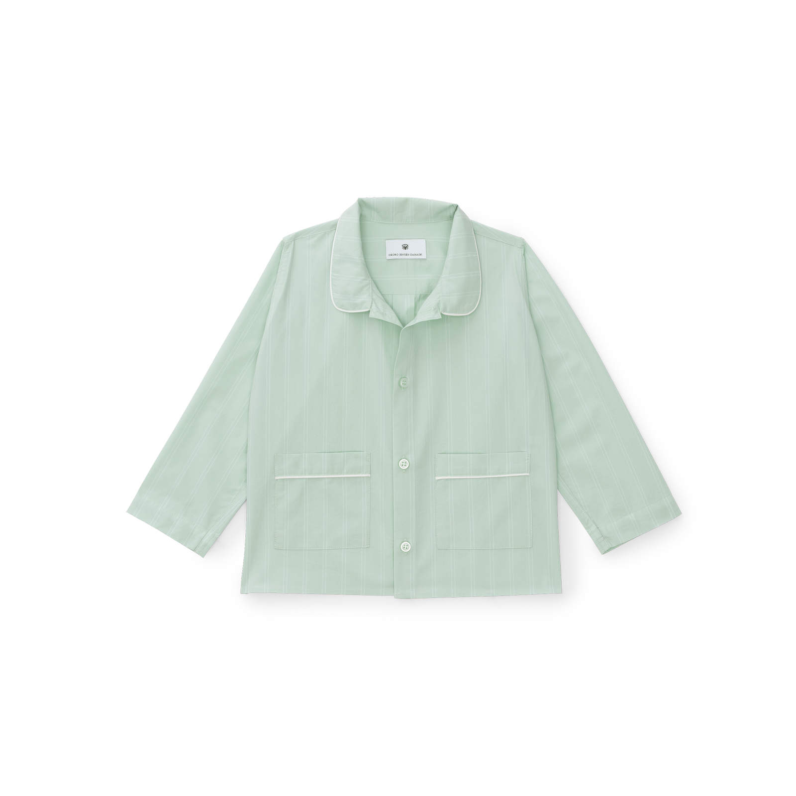 Unisex pyjamas til børn percalevævet i supimabomuld. Pyjamassen har et klassisk snit, elegante, hvide pipings og slanke nålestriber med en baggrund i farven Glass Green - en klar, grønblå nuance, der er inspireret af farven råglas.