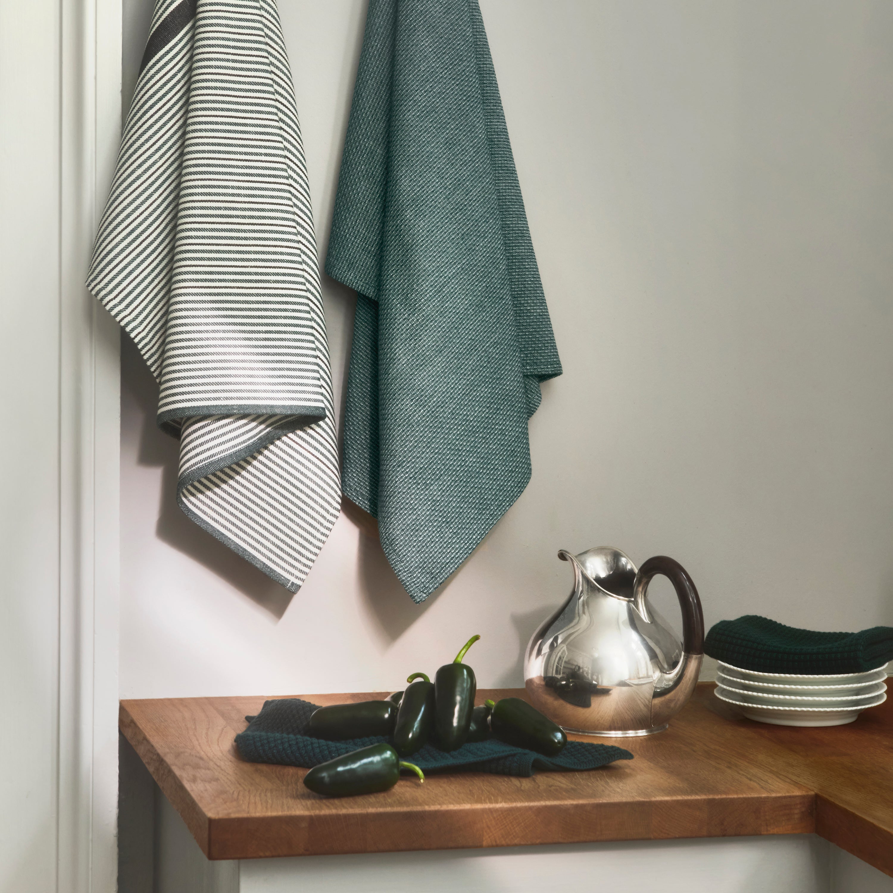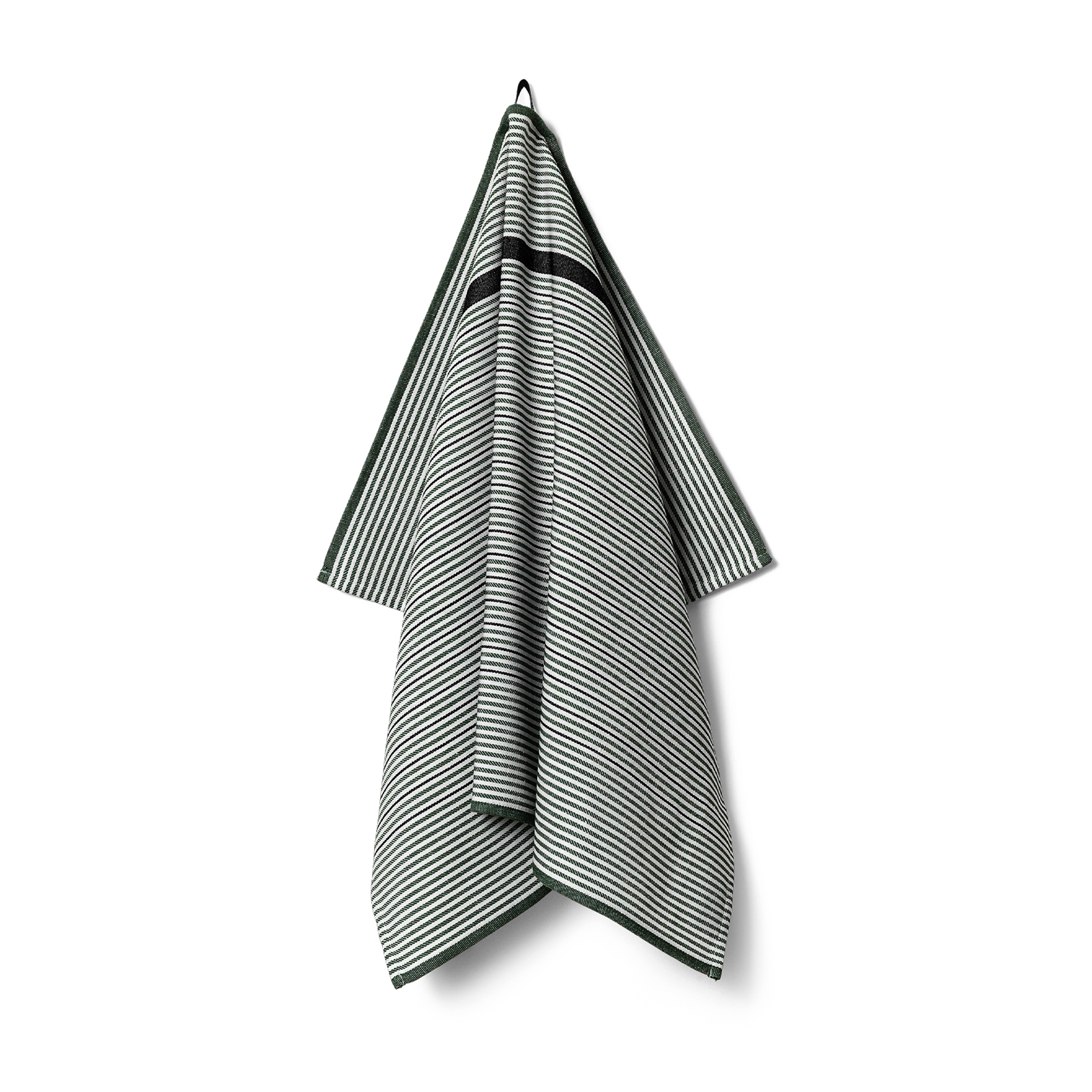 Comet er et enkelt viskestykke med klassiske striber. Det er vævet i en blanding af bomuld og hør, hvilket giver optimale tørreegenskaber. I farven Evergreen er de slanke, mørkegrønne striber kombineret med sorte for et elegant udtryk.
