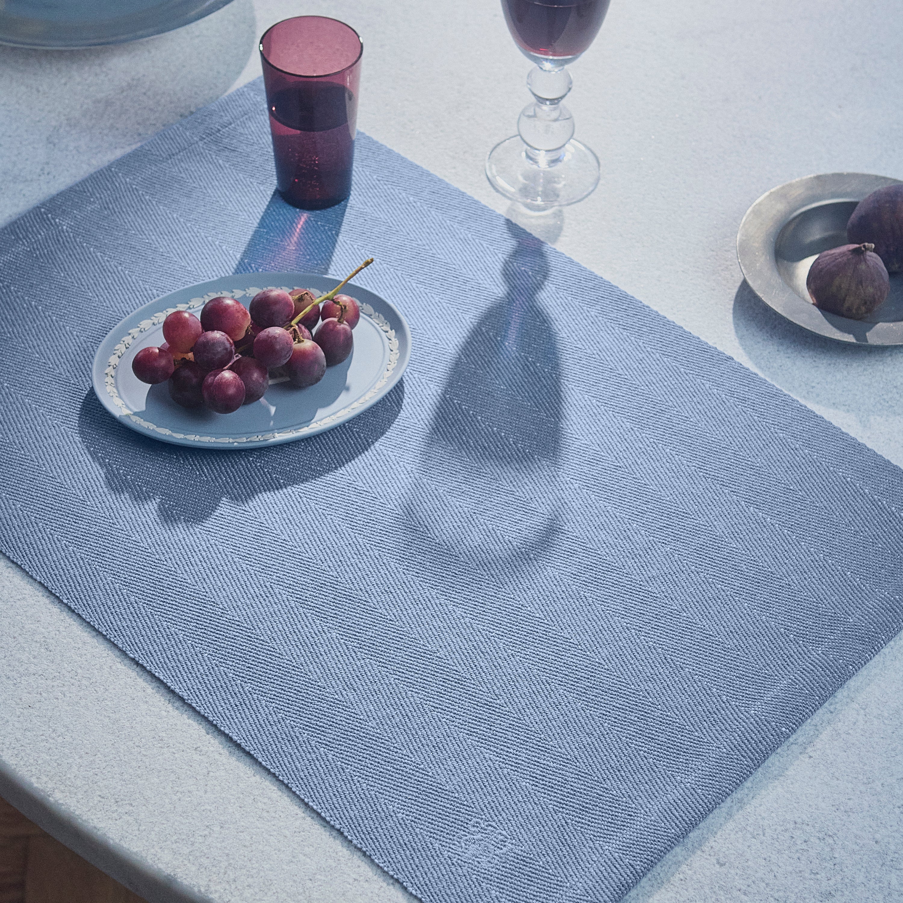 Dæk et elegant bord med Herringbone dækkeservietterne i Blue Hour – en smuk og tidløs, mellemblå farve.