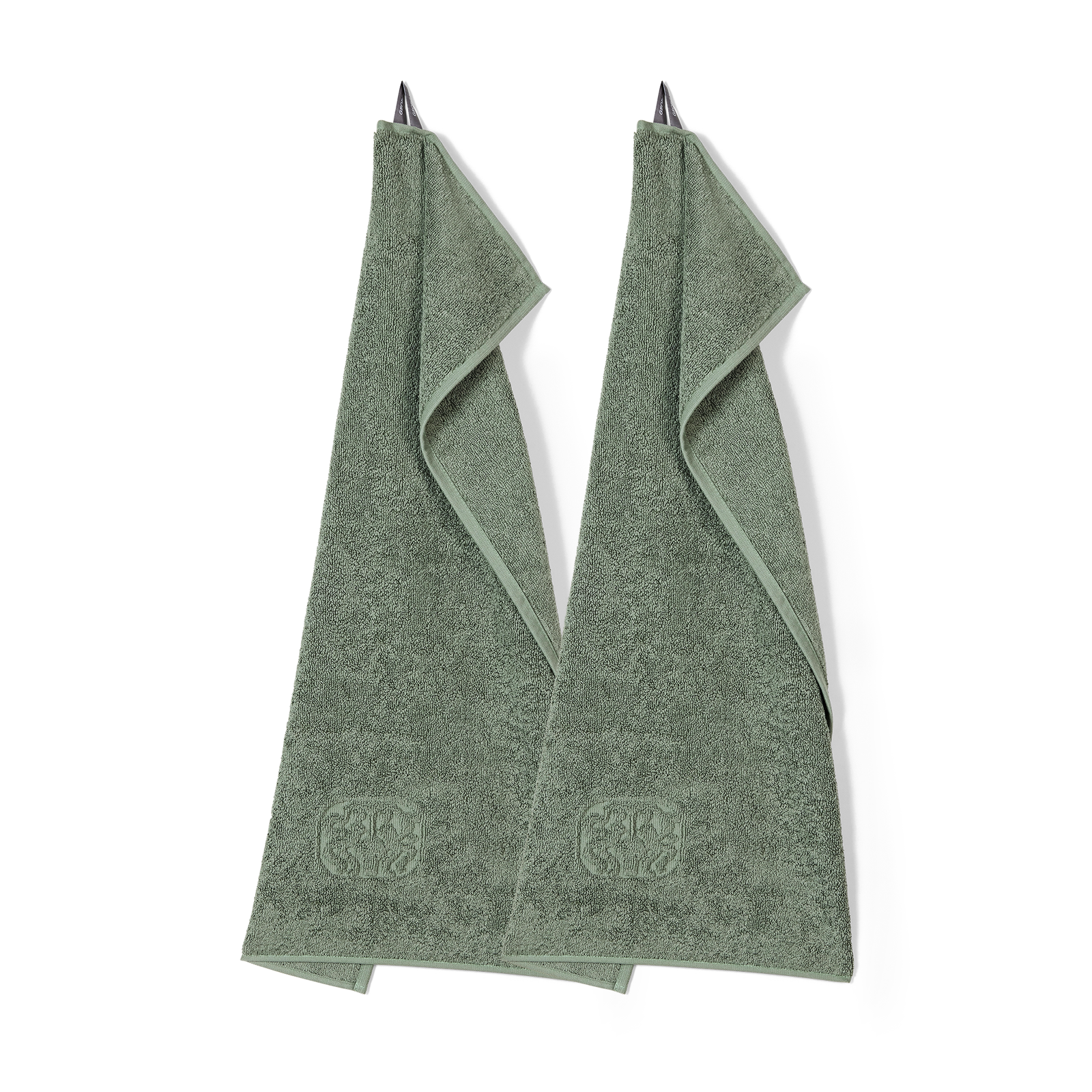 Pakke med to Damask Terry gæstehåndklæder i farven Mineral Green – en smuk, støvet nuance af grøn.
