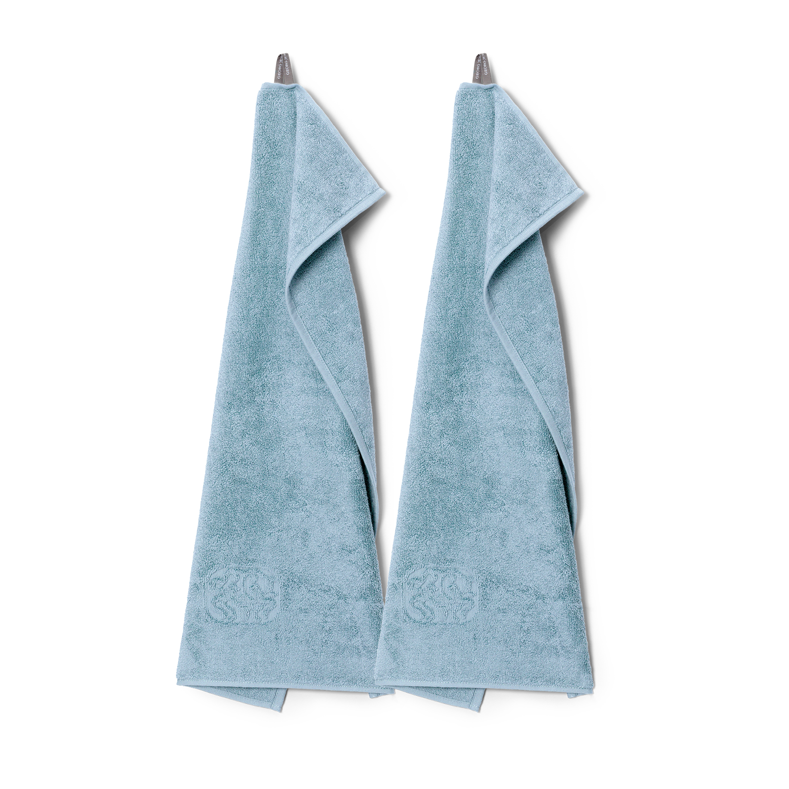2 stuks Damask Terry gastendoeken in de kleur Blue Hour – een prachtige en tijdloze middentint blauw. De gastendoeken hebben een eenvoudig design met het iconische Georg Jensen Damask-logo, elegant ingeweven als detail.