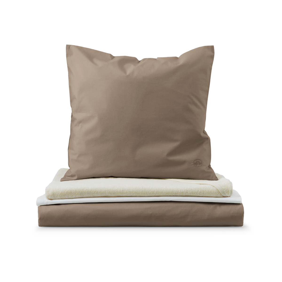 Het babypakket is pure verwennerij voor de allerkleinsten. De Percale geweven bedset is ontworpen voor een goede nachtrust. Het is zacht, ademend en geweven van 100% biologisch katoen. De babyhanddoek is gemaakt van zachte en dikke badstof van biologisch katoen. In de kap is een klein logo geweven.