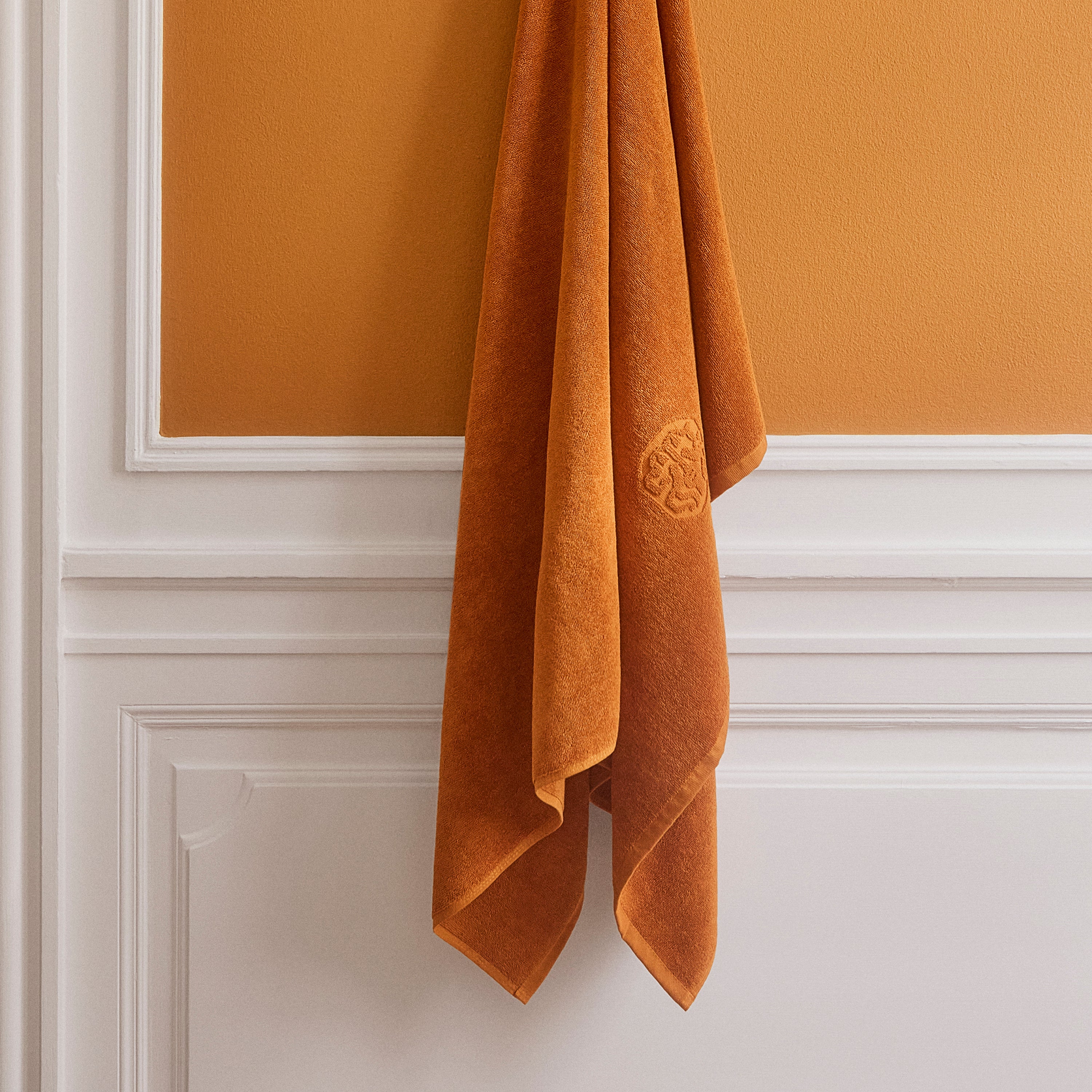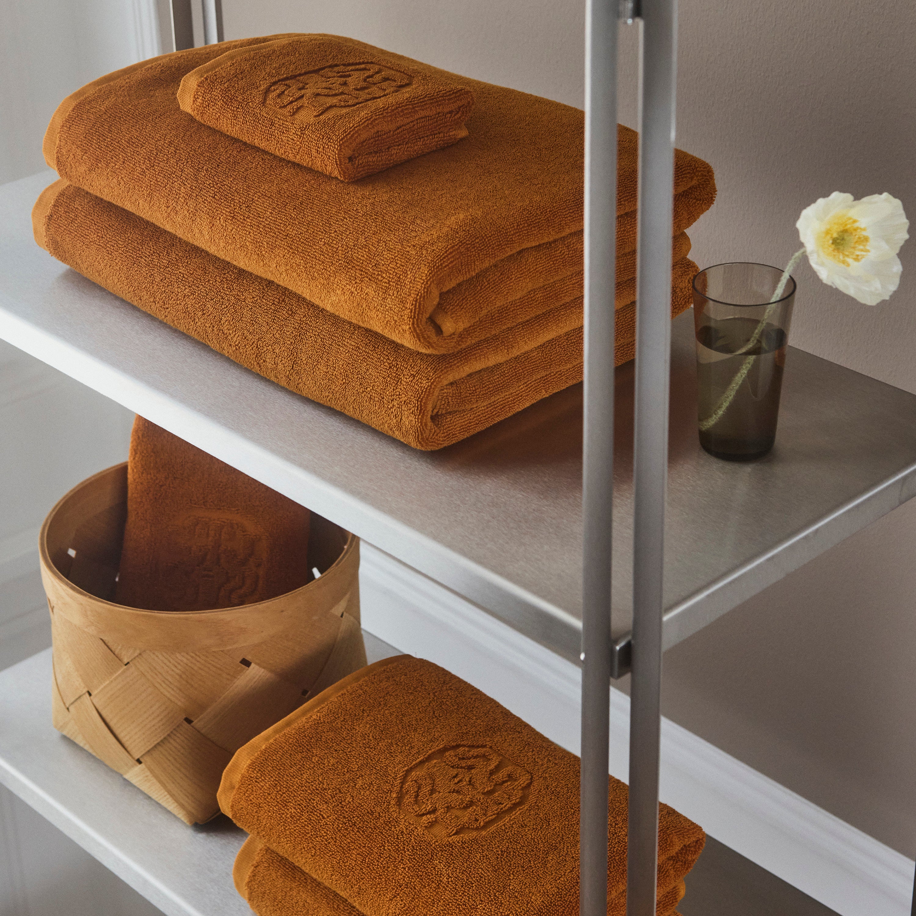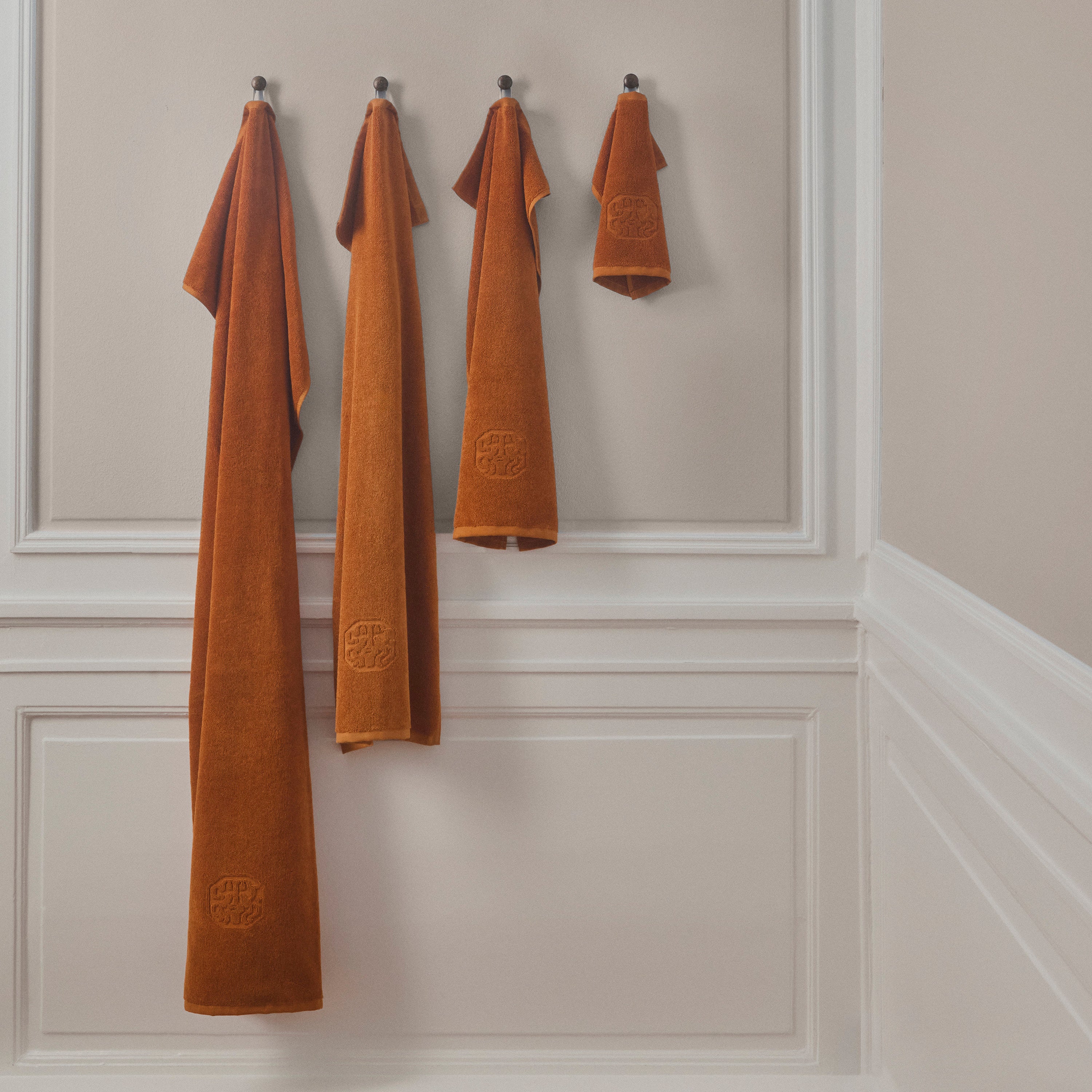 Damask Terry badehåndklædet har et enkelt udtryk med Georg Jensen Damasks ikoniske logo indvævet som elegant detalje. Chanterelle er en dyb orange med undertoner af karamel. Farven er inspireret af kantarellens smukke nuancer.