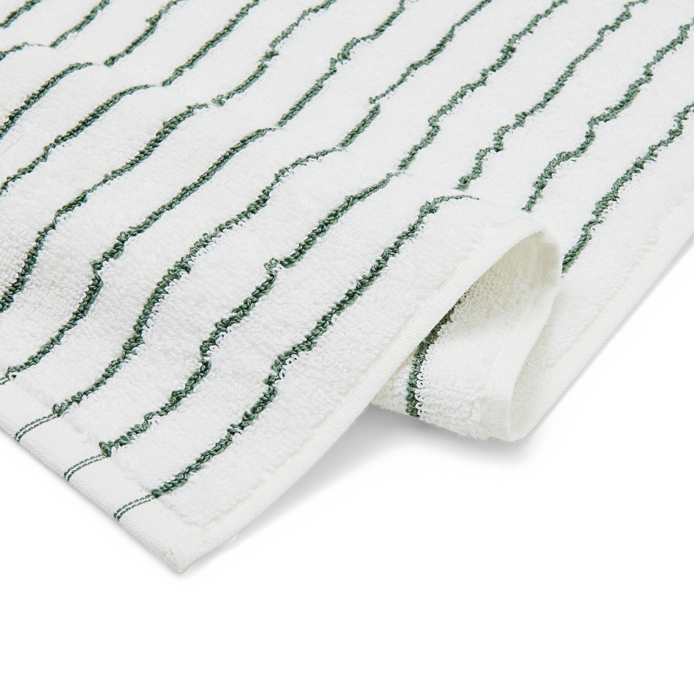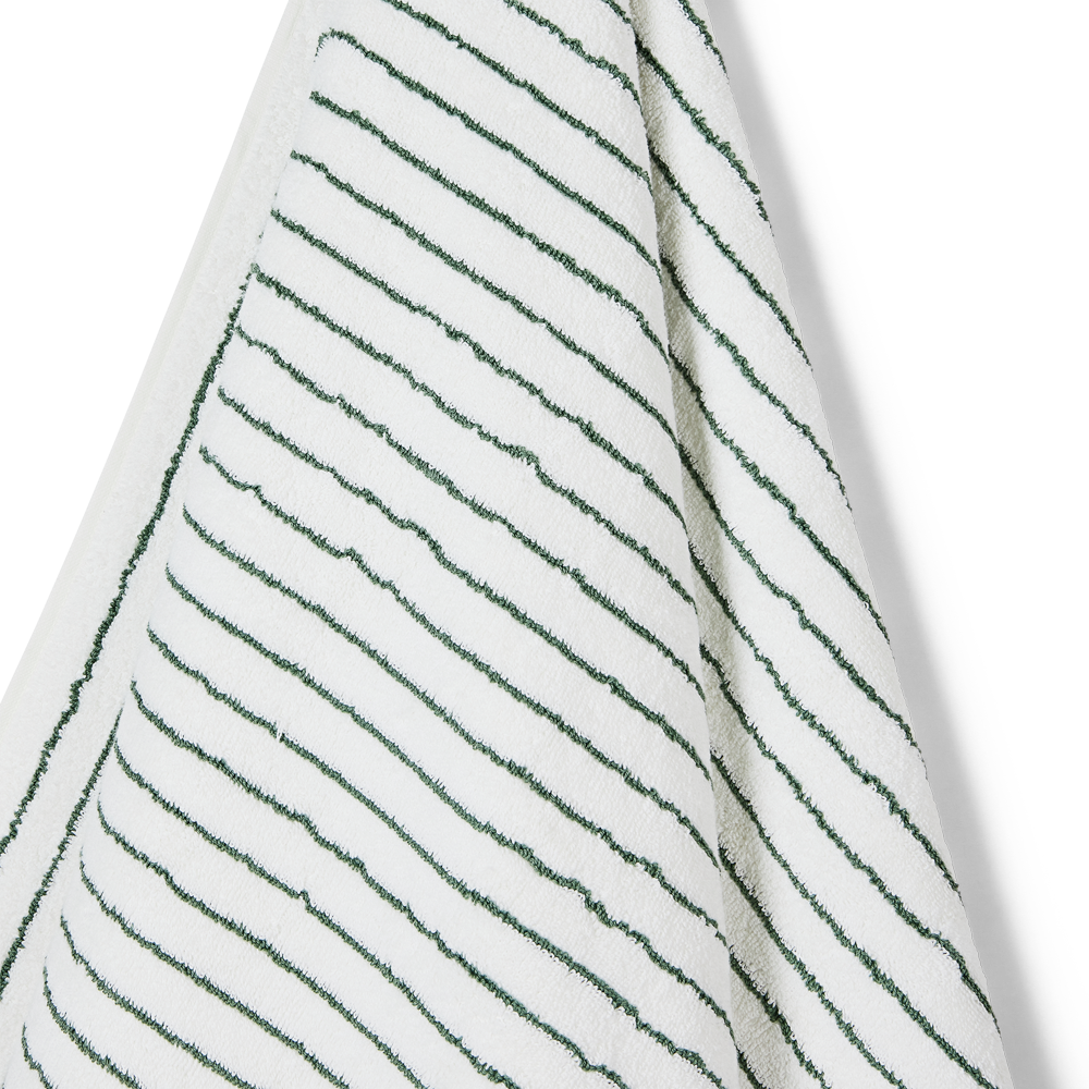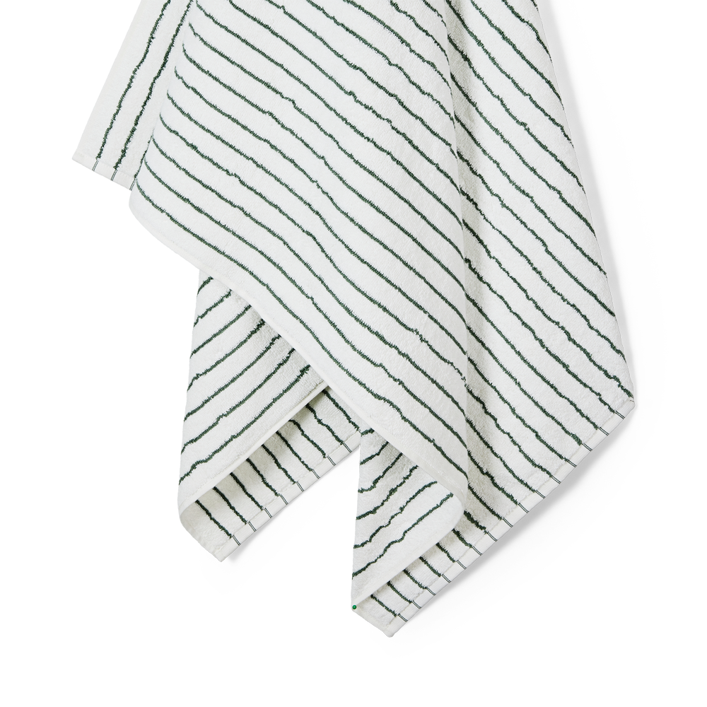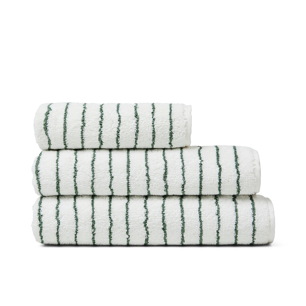 De smalle donkergroene en witte strepen geven de handdoeken een moderne uitstraling. De gestreepte handdoeken zijn mooi op zichzelf - of gecombineerd met effen gekleurde badstof. Onze badstof wordt steeds beter naarmate hij vaker gebruikt wordt.