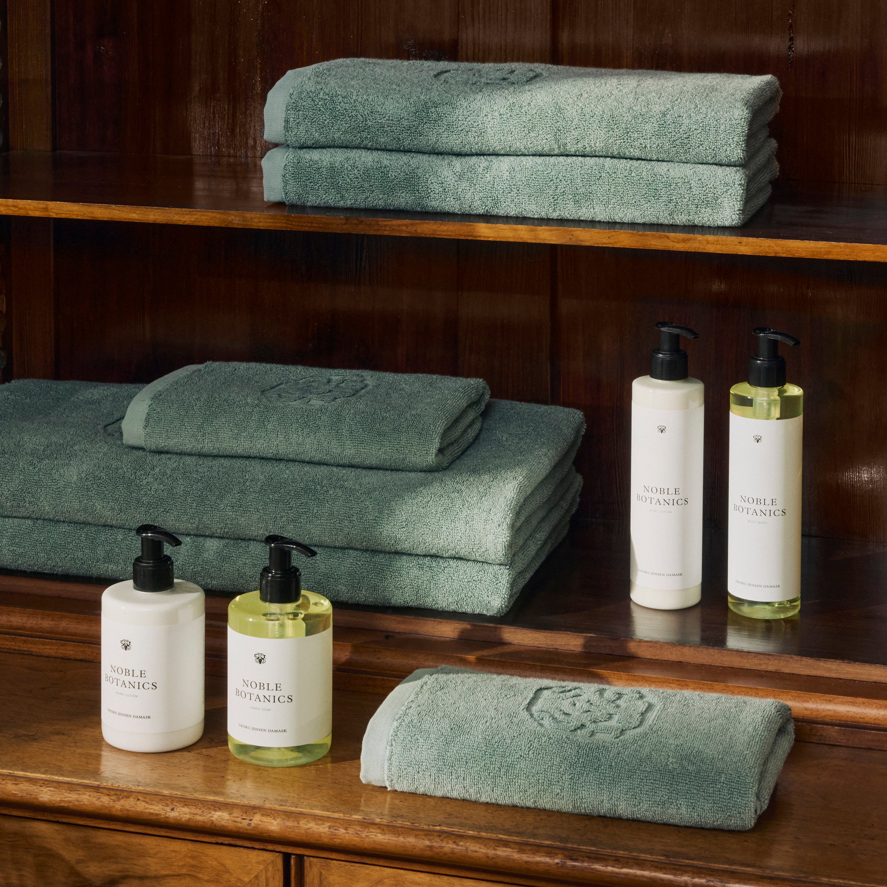 Groot en zacht Damask Terry badlaken in de kleur Sage Green – Sage Green is een koele groentint. Als elegant detail heeft het badlaken het iconische logo van Georg Jensen Damask ingeweven.
