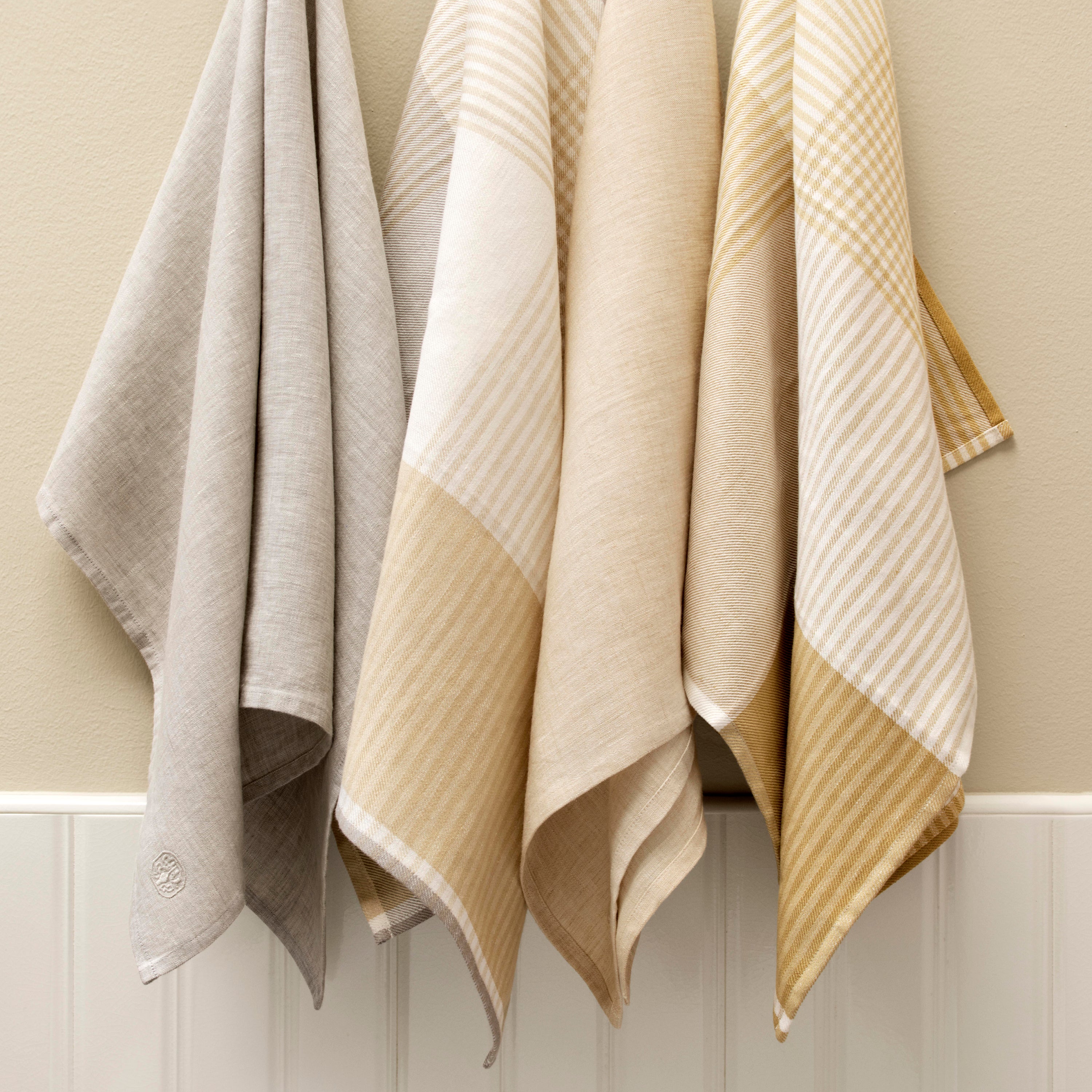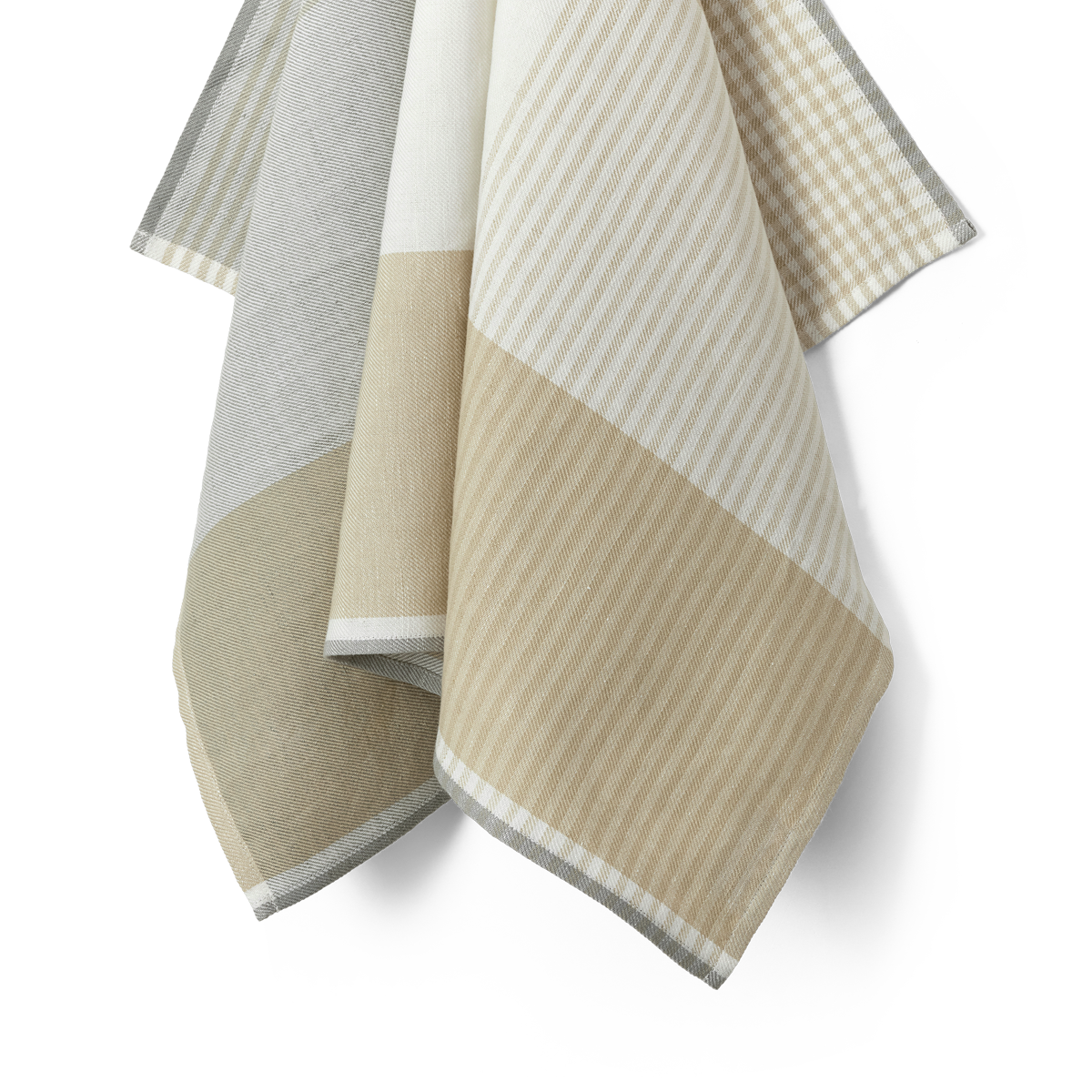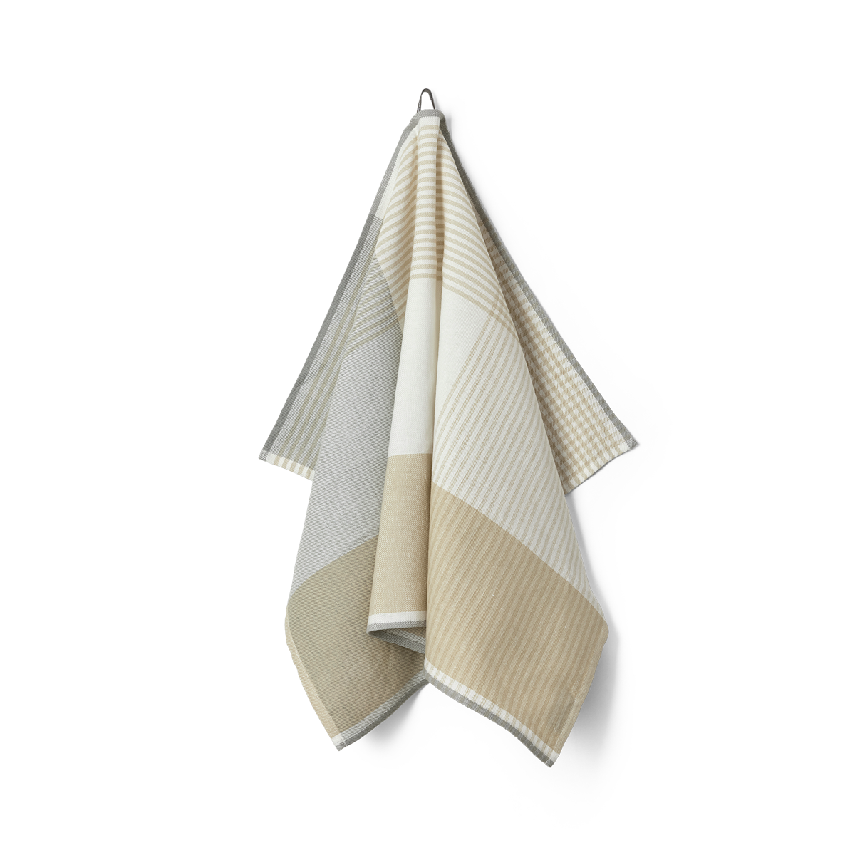 Combineer de beige theedoek met keukenhanddoeken en theedoeken in dezelfde tint of mix de kleuren uit de collectie om een persoonlijke expressie te creëren.