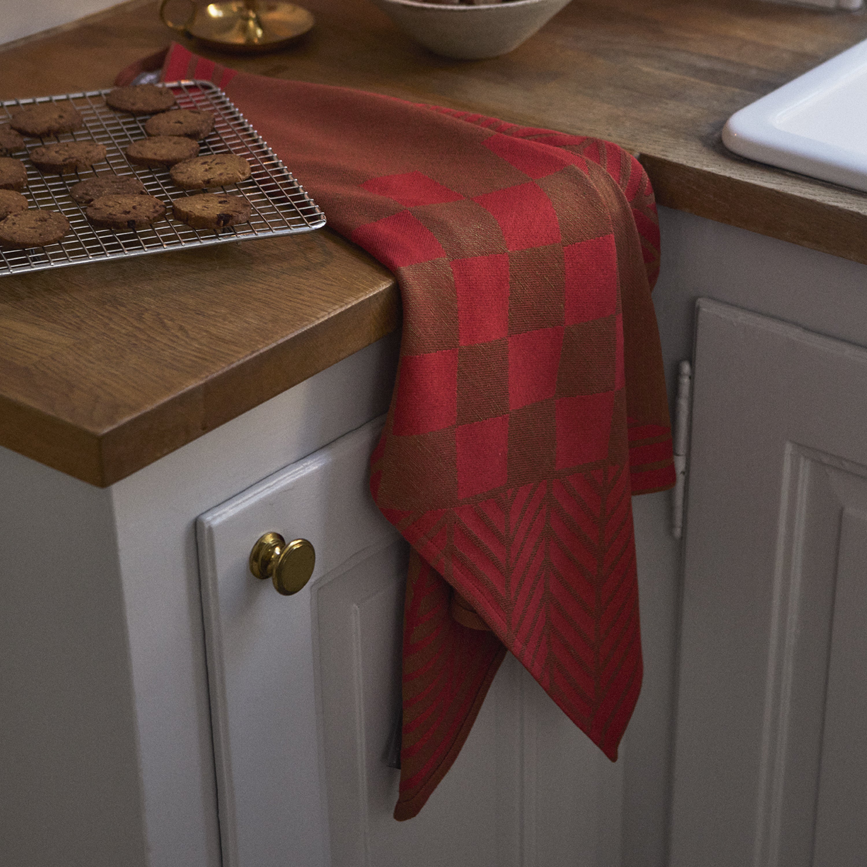 Het klassieke kerstmotief van de Christmas-theedoek met gevlochten kersthartjes en gestileerde dennetakken brengt de feestelijke sfeer de keuken in. De combinatie van linnen en katoen zorgt voor een optimale absorptie. De kleurcombinatie Archive Red behoort tot de originele kleuren van 1975.