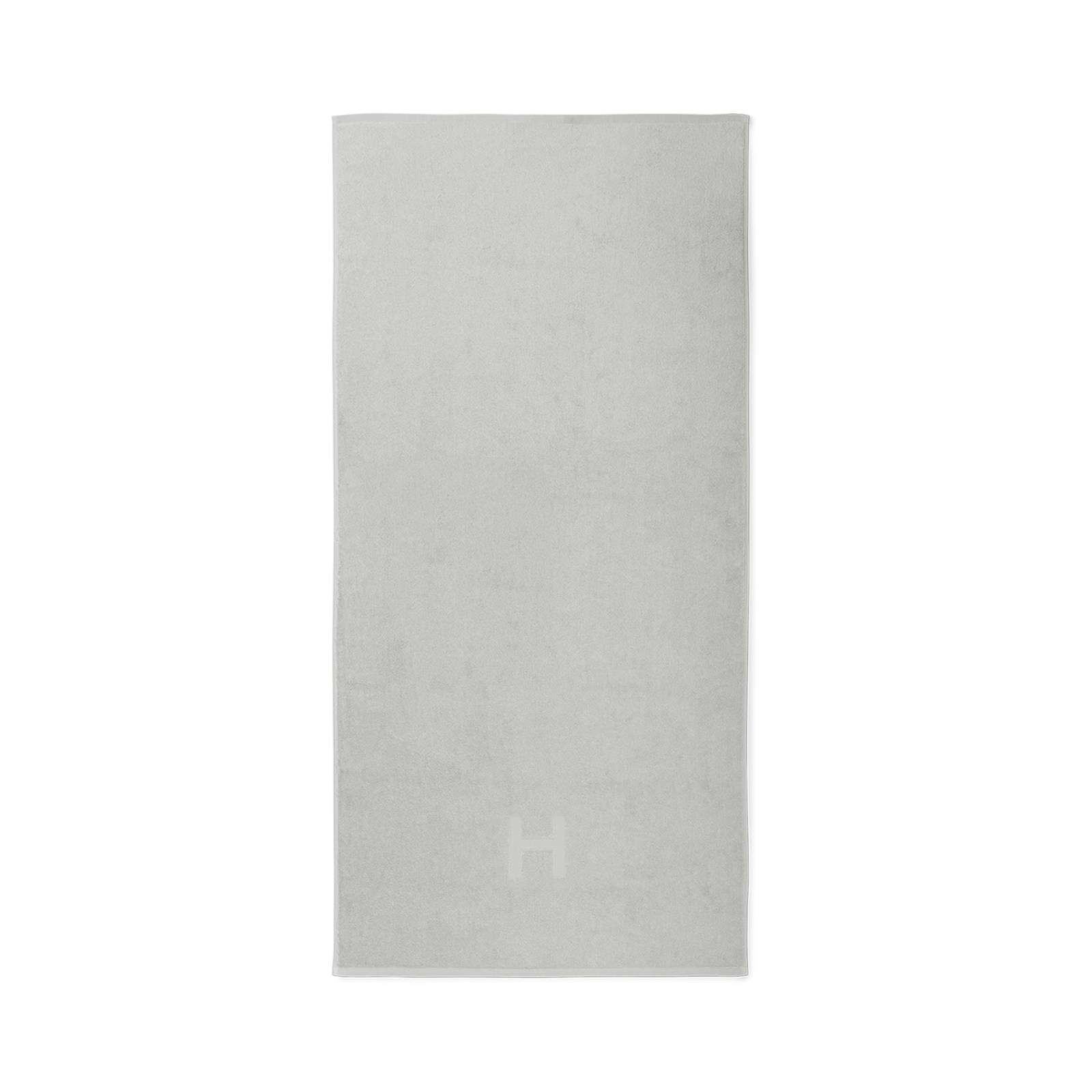 Damask Terry badehåndklæde med indvævet H bogstav. Badehåndklædet er jacquardvævet i 100 % dobbelttvundet, kæmmet bomuld med bogstav i relief. Det er både blødt, glansfuldt og slidstærkt. Den elegante farve, Platinum Grey, er en let og kølig nuance af grå.