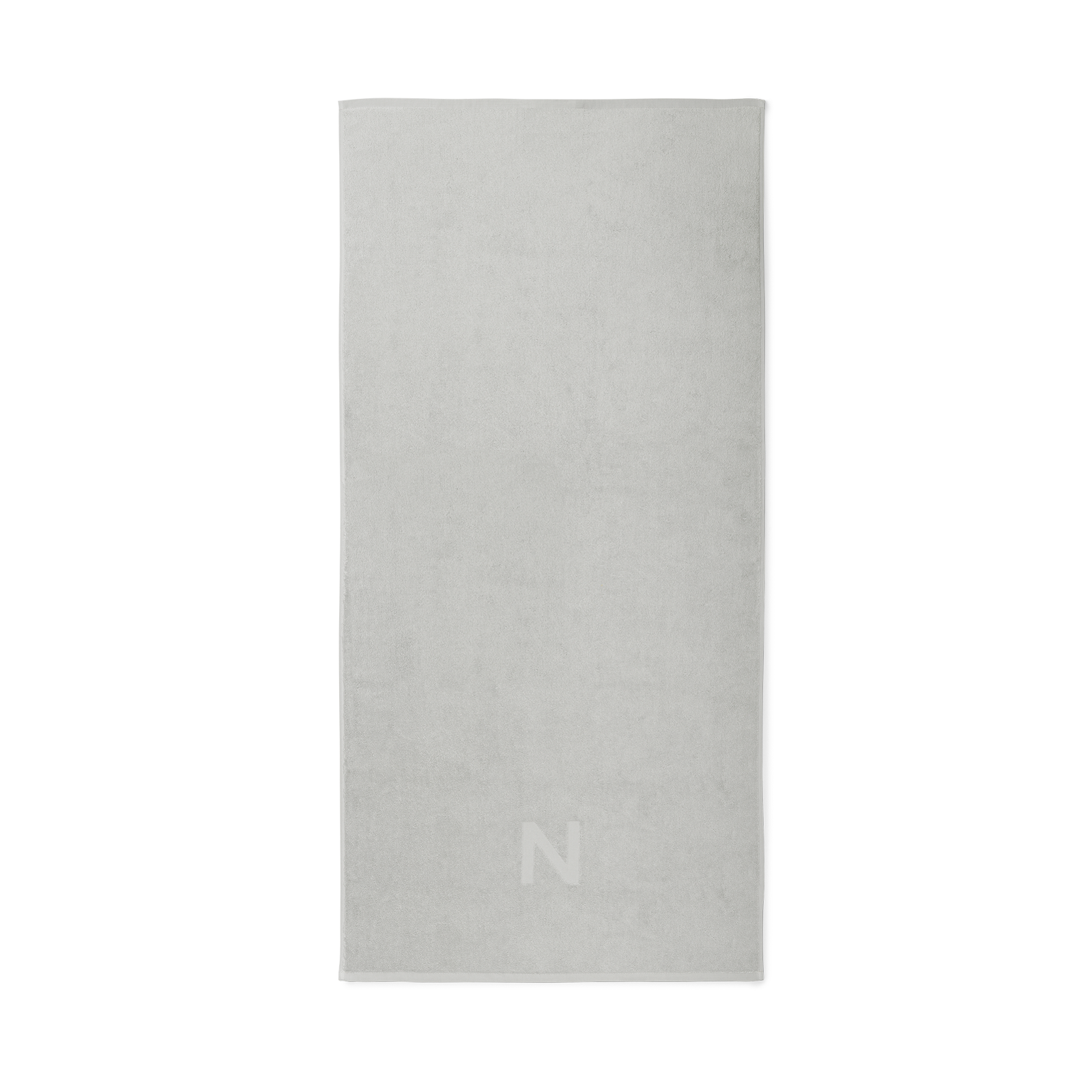 Damask Terry badehåndklæde med indvævet N bogstav. Badehåndklædet er jacquardvævet i 100 % dobbelttvundet, kæmmet bomuld med bogstav i relief. Det er både blødt, glansfuldt og slidstærkt. Den elegante farve, Platinum Grey, er en let og kølig nuance af grå.