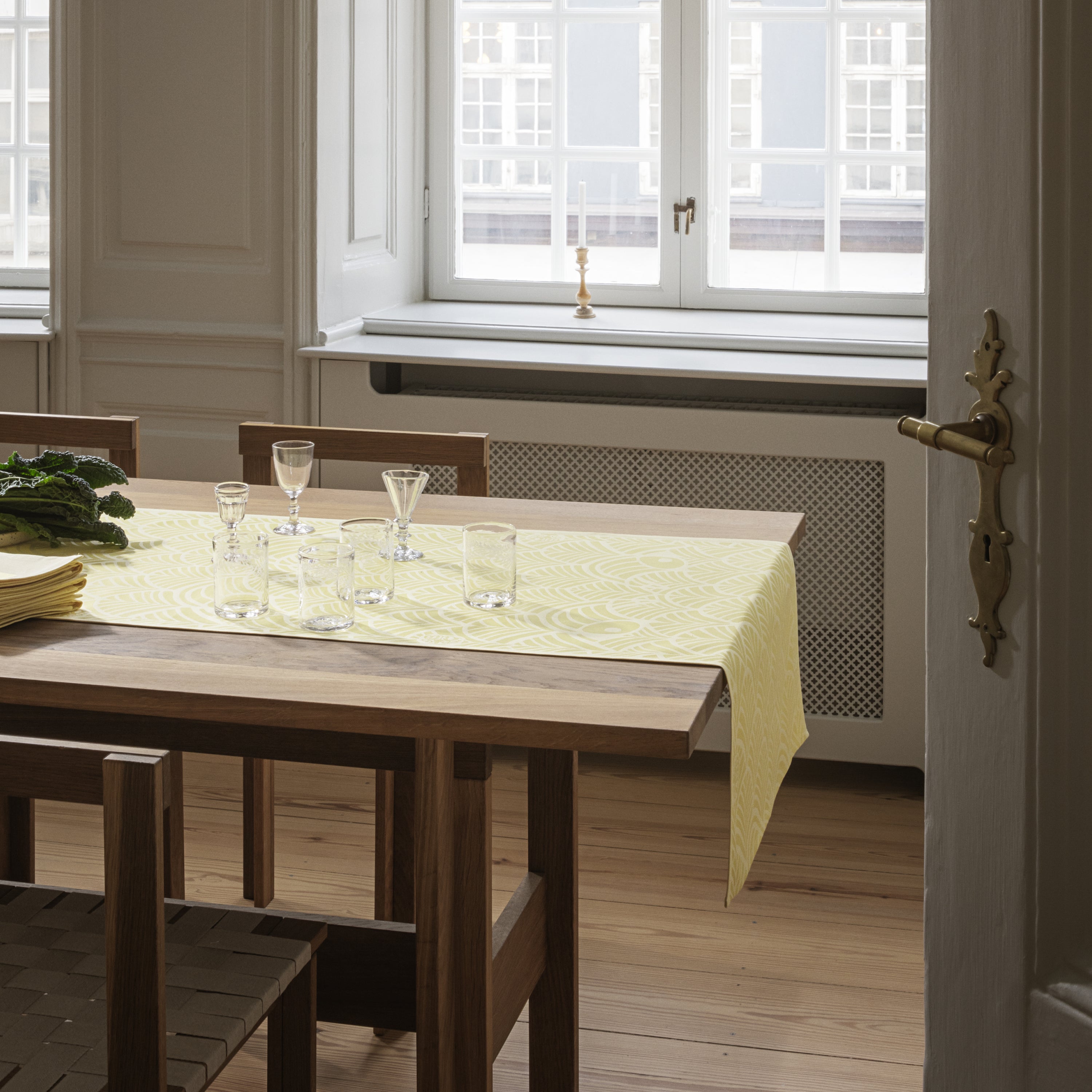 Met zijn verfijnde gele kleur is het tafelloper niet alleen de perfecte achtergrond voor de paasdecoraties en -tradities die generaties samenbrengen aan tafel. Het wordt ook een traditie op zich die jaar na jaar een plezier is om met Pasen tevoorschijn te halen. Bijpassende stoffen servetten maken de look compleet.