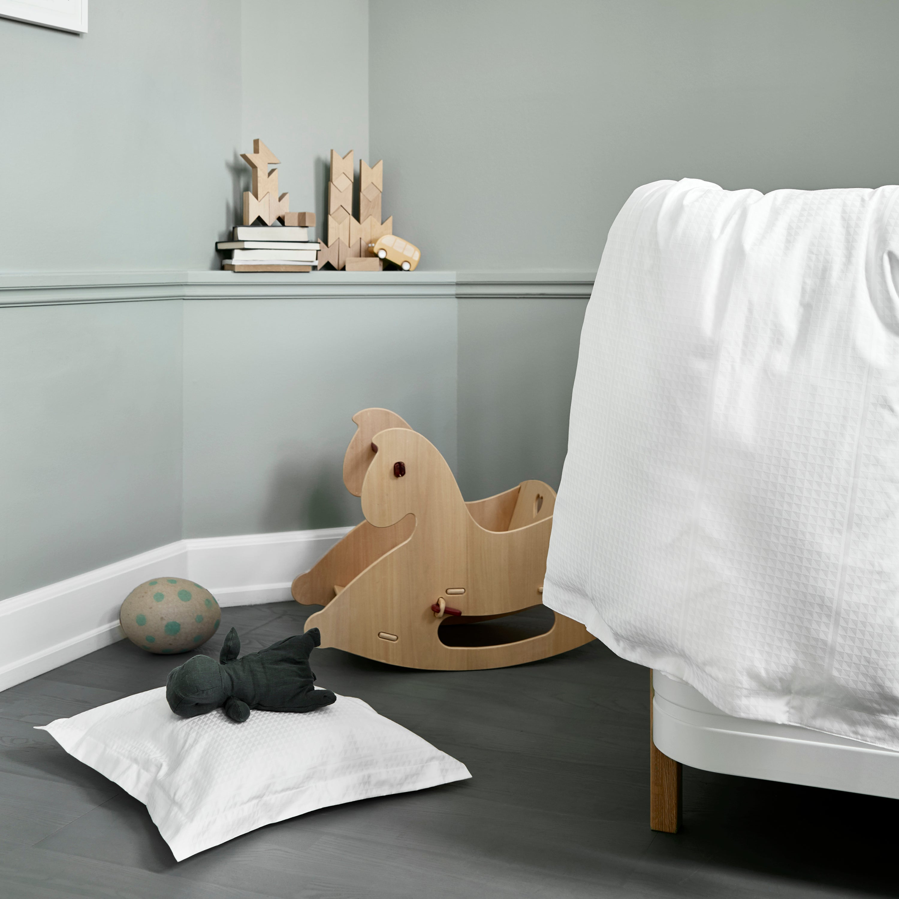 Het witte bedlinnen heeft een puurheid, elegantie en ingetogen schoonheid die in elke kinderkamer past. Een baby- en juniorlaken van Georg Jensen Damask in een effen canvasbinding maakt de look compleet.