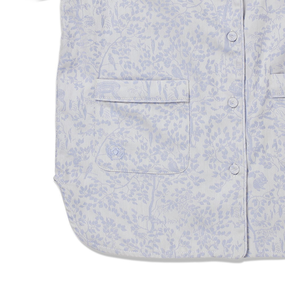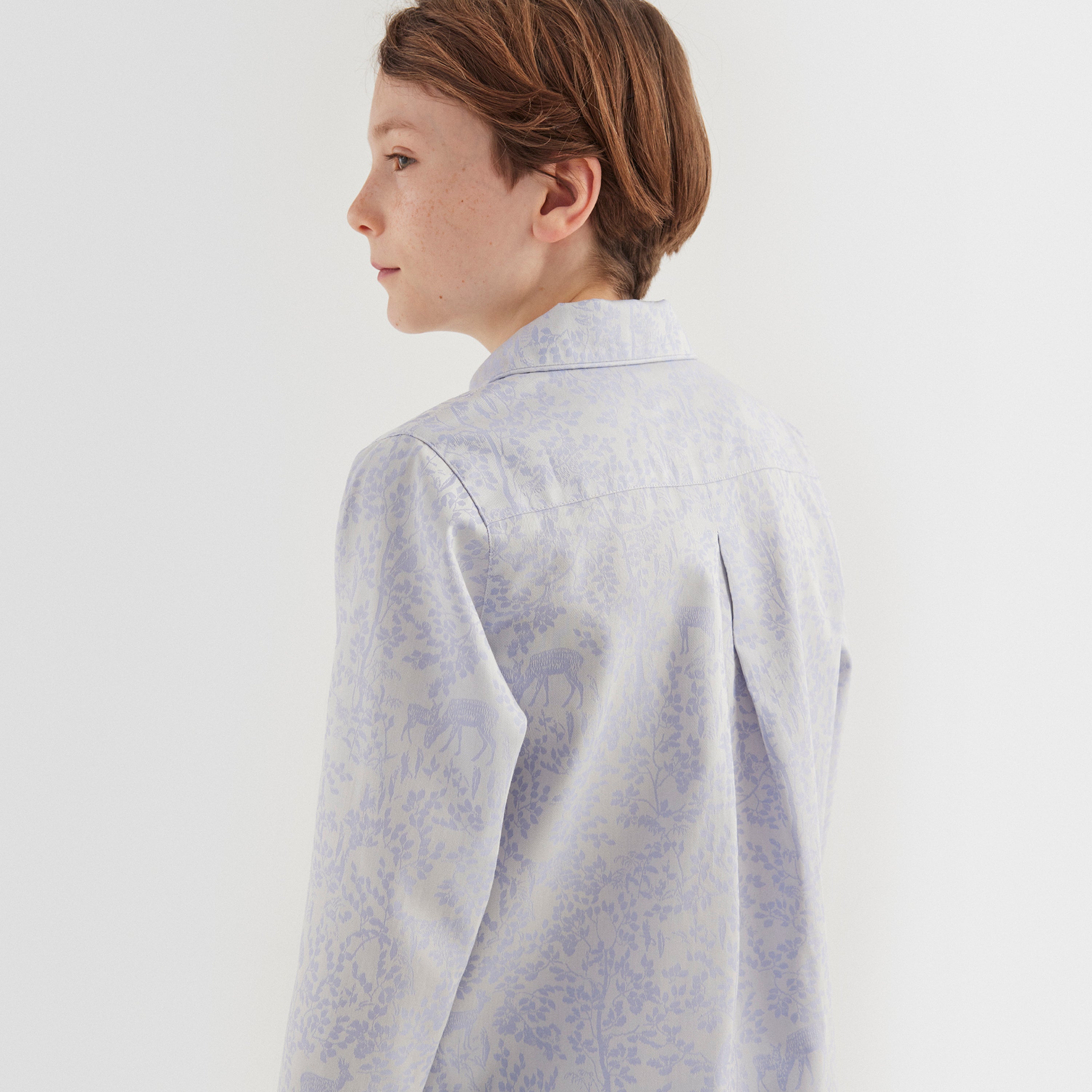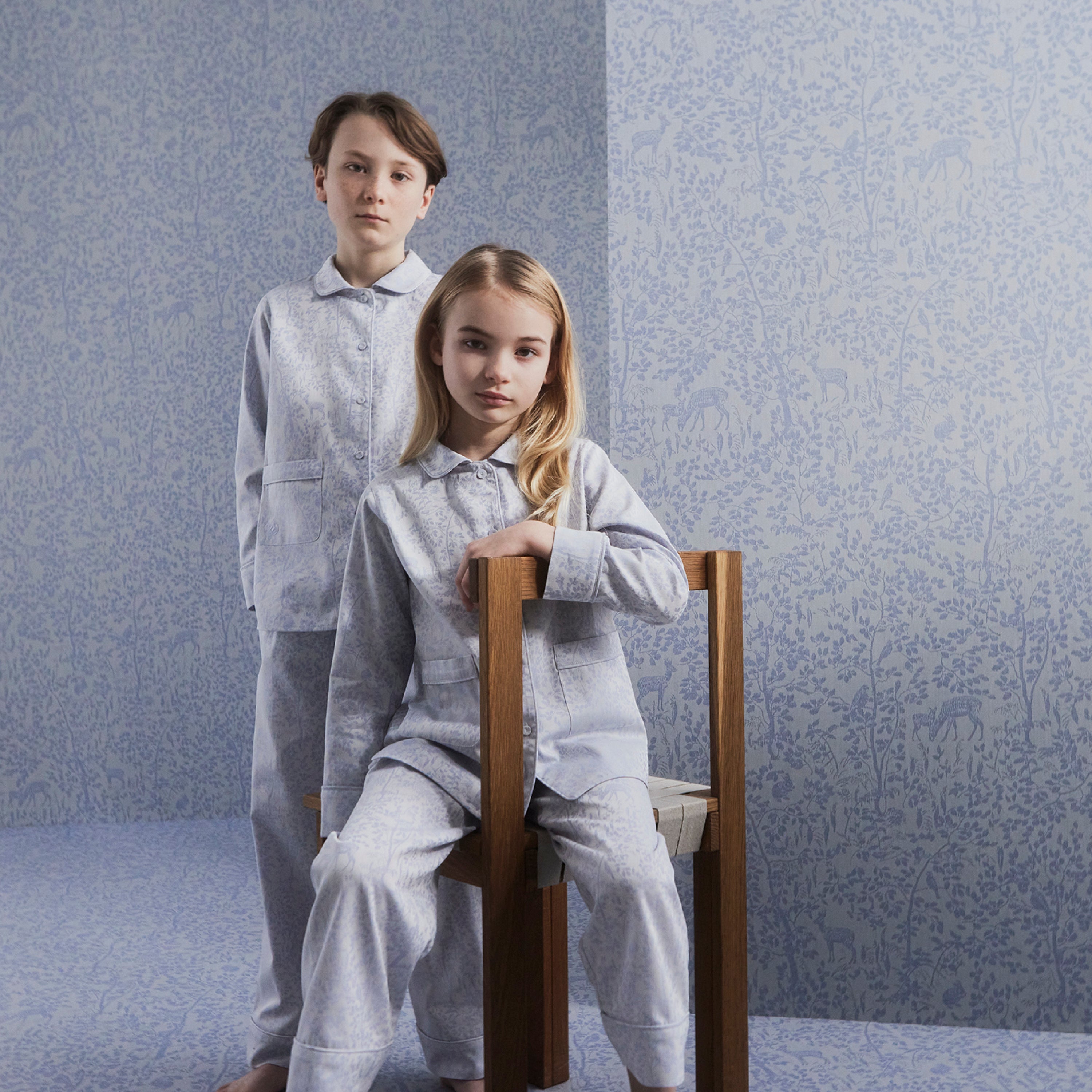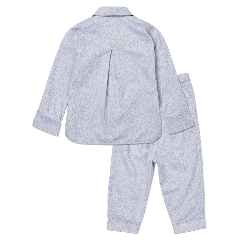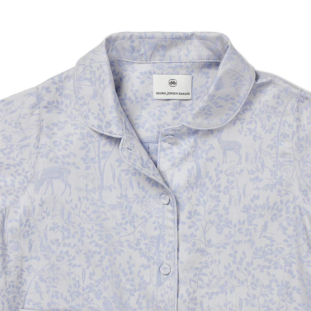 De pyjama in de kleur Clear Blue maakt deel uit van de jacquard geweven kindercollectie Forest. De pyjamaset is gemaakt van biologisch katoen en heeft een klein Georg Jensen Damask kinderlogo geborduurd op de rechterzak.