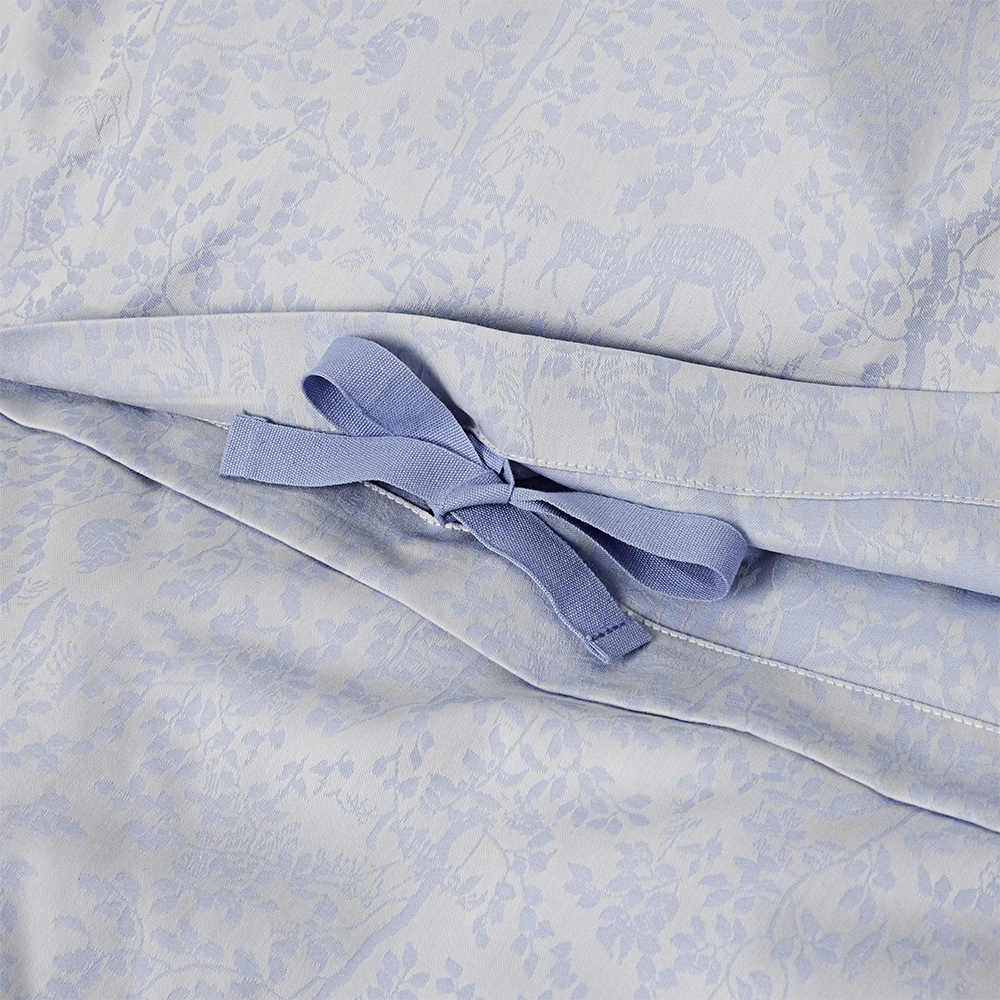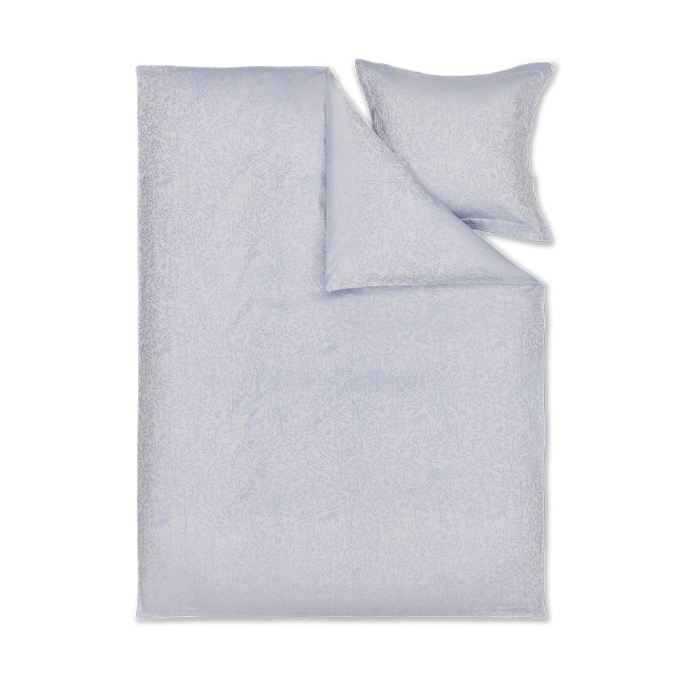 Forest is een jacquard geweven kinder beddengoed set van 100% biologisch katoen. Het beddengoed in de kleur Clear Blue heeft het karakteristieke Georg Jensen Damask kinderlogo geborduurd in één hoek.