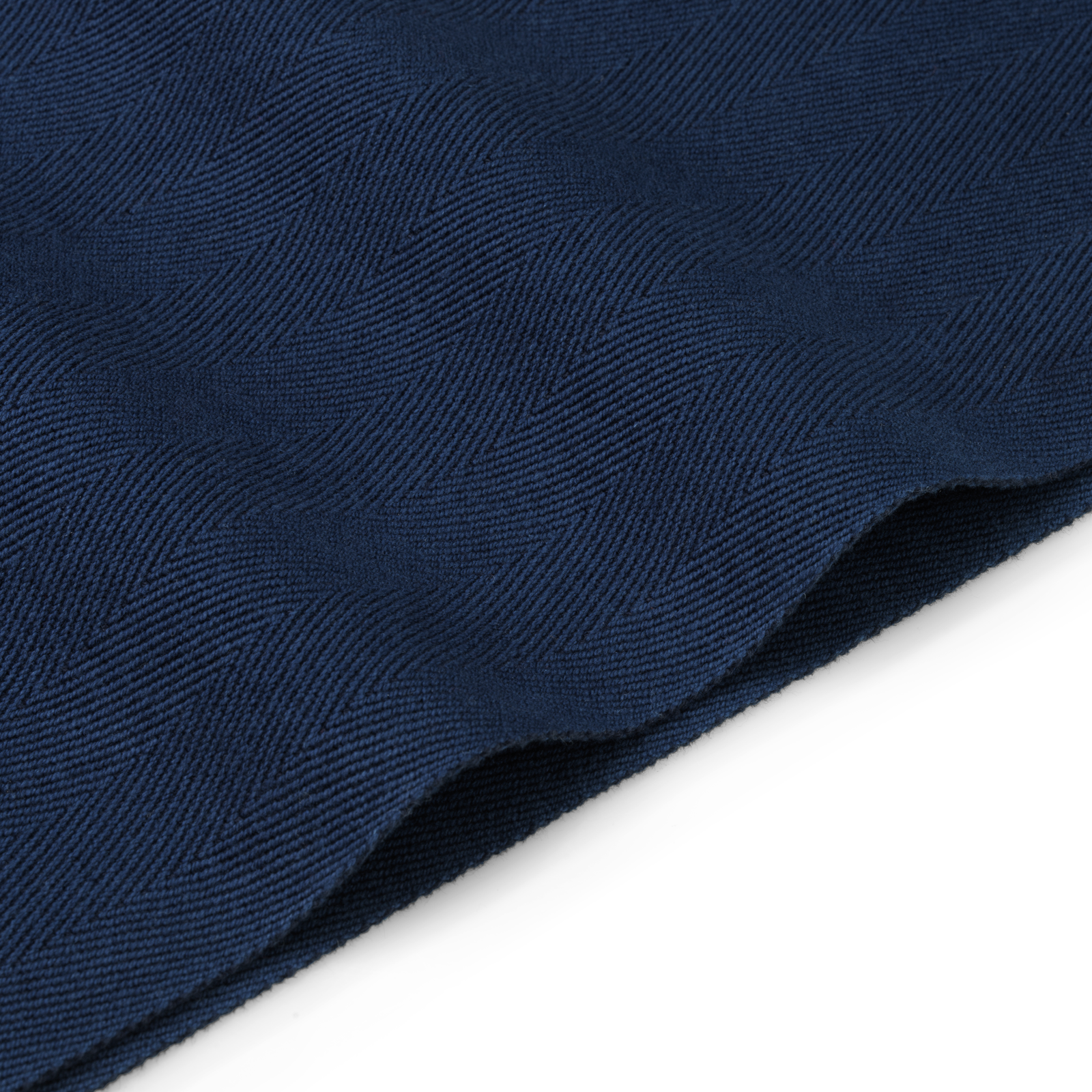 Dek een elegante tafel met de visgraat tafelloper in donkerblauw. De klassieke tafelloper is geweven van 100% zware katoen. De weefmethode geeft het karakteristieke visgraatpatroon en door de zware garens voelt de tafelloper zwaar aan op tafel. Het heeft een klein geborduurd logo in dezelfde kleur als het weefsel.