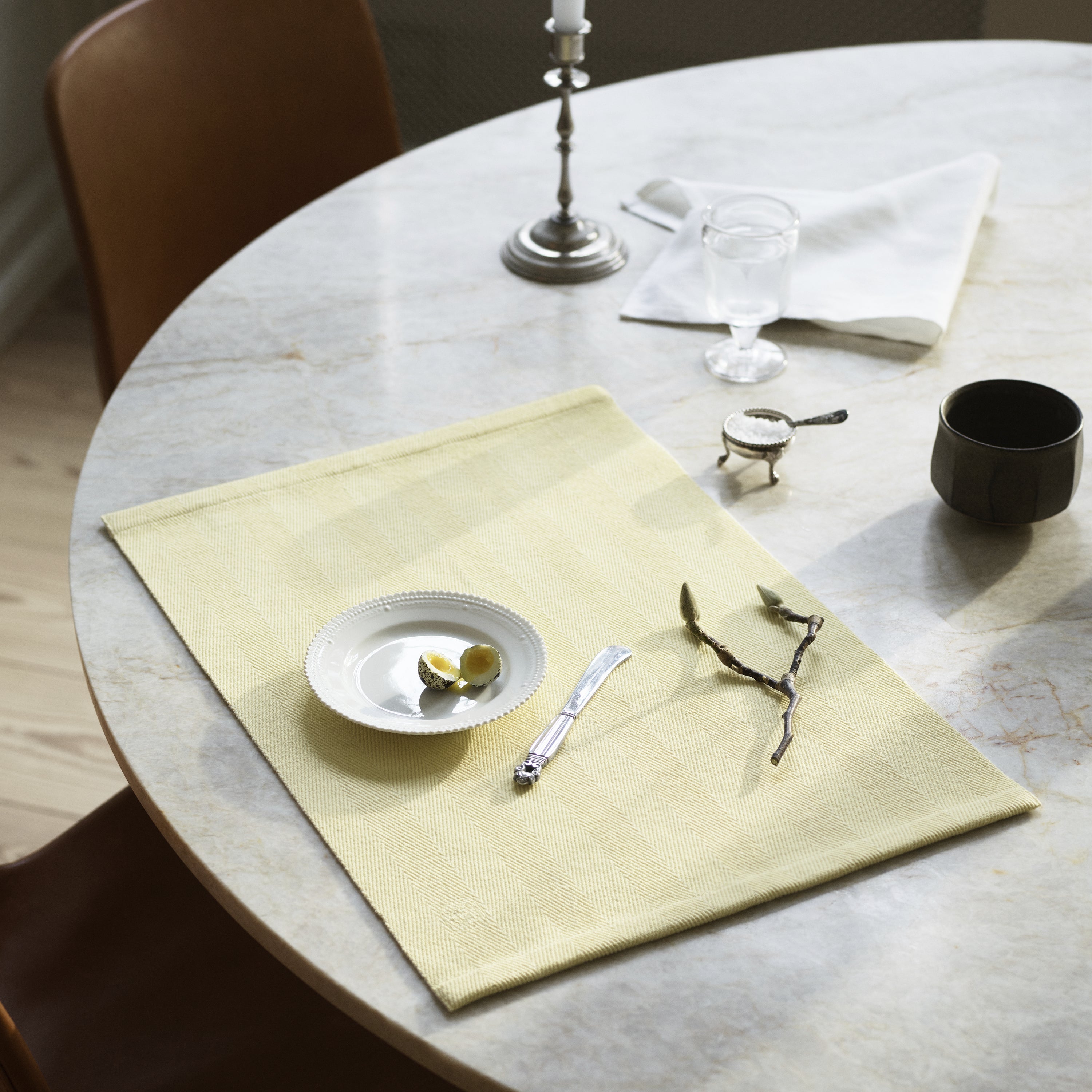 Herringbone is een zwaar visgraat geweven placemat van 100% katoen. De placemat ligt goed op tafel en heeft een klein geborduurd Georg Jensen Damask logo. Met de zachtgele kleur ben je verzekerd van eeuwige zonneschijn in je keuken.