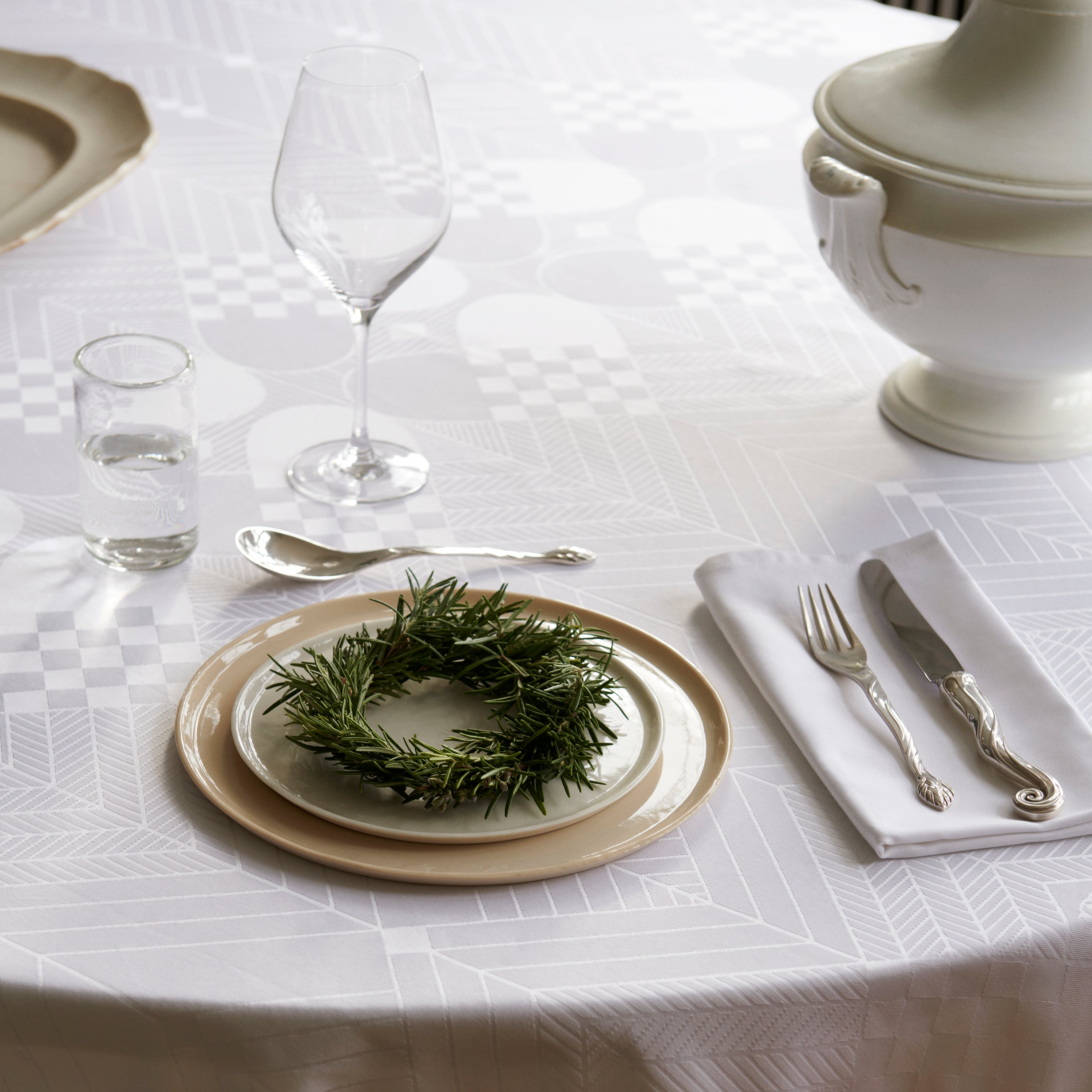 In de witte versie steekt het iconische patroon af tegen een prachtige sneeuwwitte achtergrond, waardoor het tafelkleed een tijdloos element wordt in de tafelsetting. Een elegant canvas dat kan worden gecombineerd met decoraties in veel verschillende kleuren of klassiek en minimalistisch kan worden gehouden.