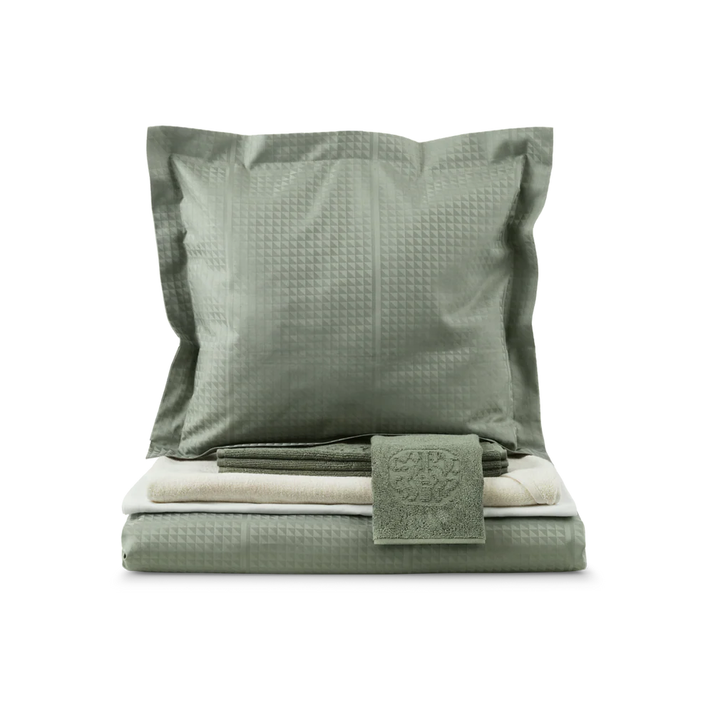 Facet sengetøjet er vævet i 100% egyptisk bomuld. Den dybe og varme grønne nuance lader smukt facetmønstret træde frem, og bidrager til det rolige udtryk. Det bløde, hvide, babylagen er lærredsvævet. Vaskekludene og Babyhåndklædet føles behagelige mod huden og har et indvævet logo som fin detalje.