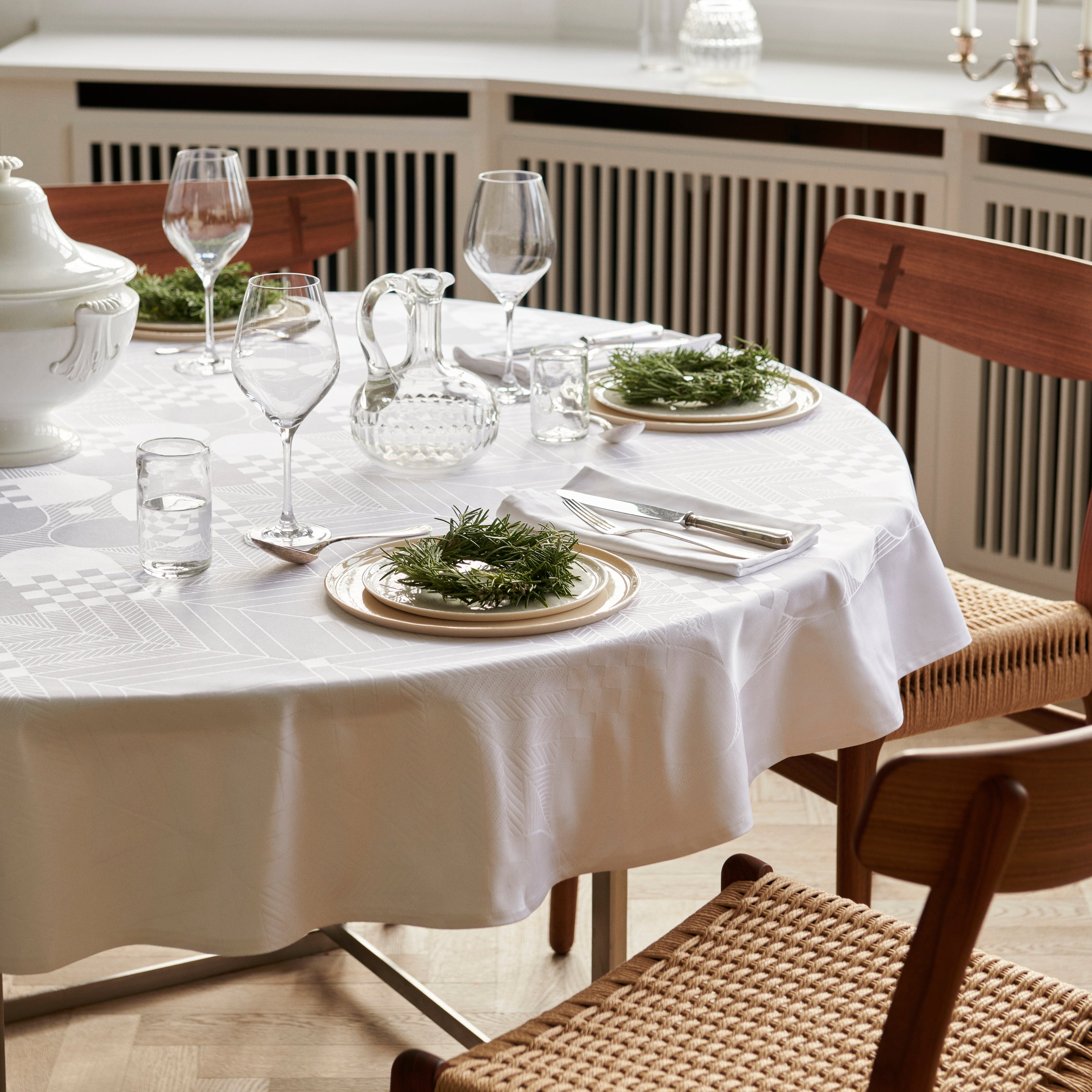 In de witte versie steekt het iconische patroon af tegen een prachtige sneeuwwitte achtergrond, waardoor het tafelkleed een tijdloos element wordt in de tafelsetting. Een elegant canvas dat kan worden gecombineerd met decoraties in veel verschillende kleuren of klassiek en minimalistisch kan worden gehouden.
