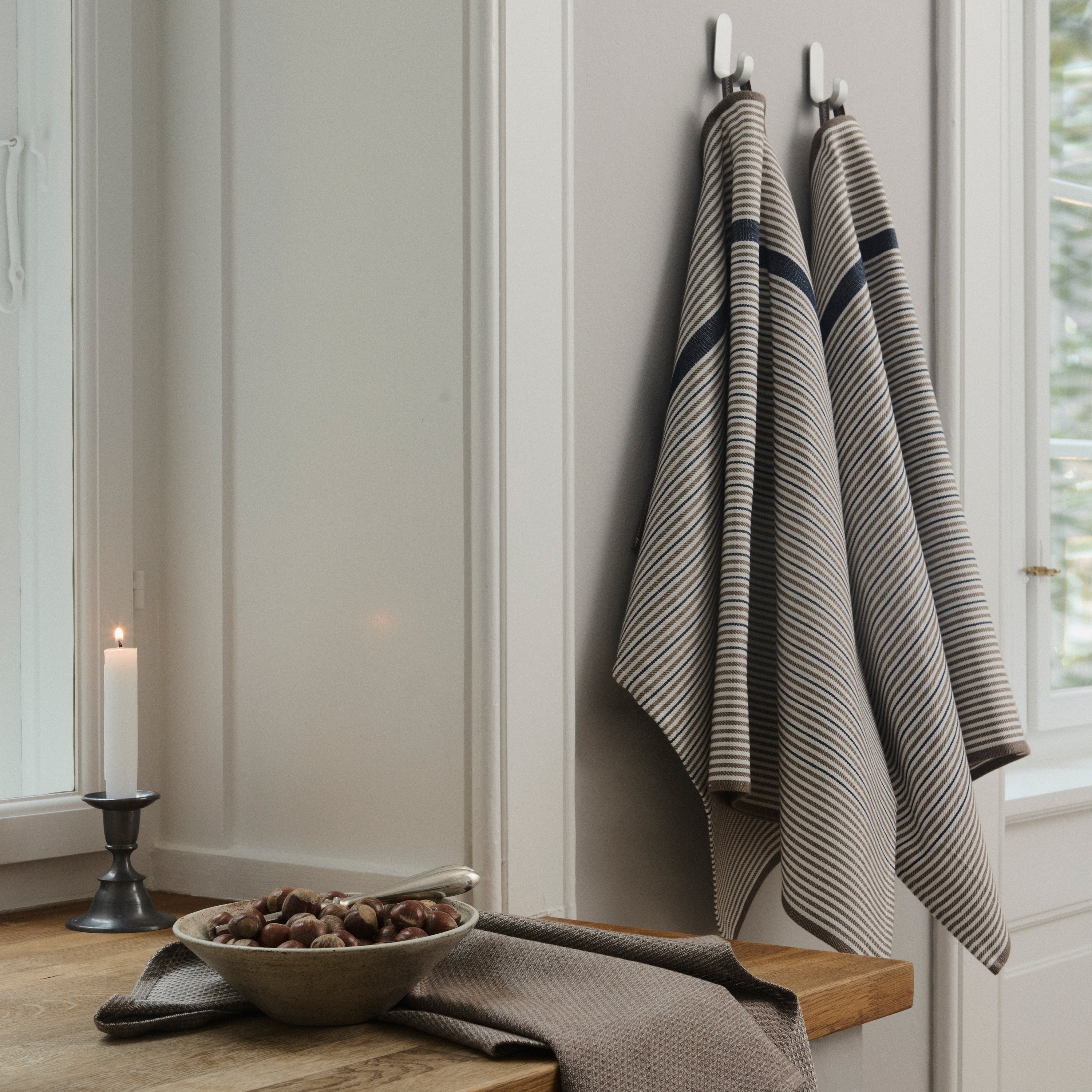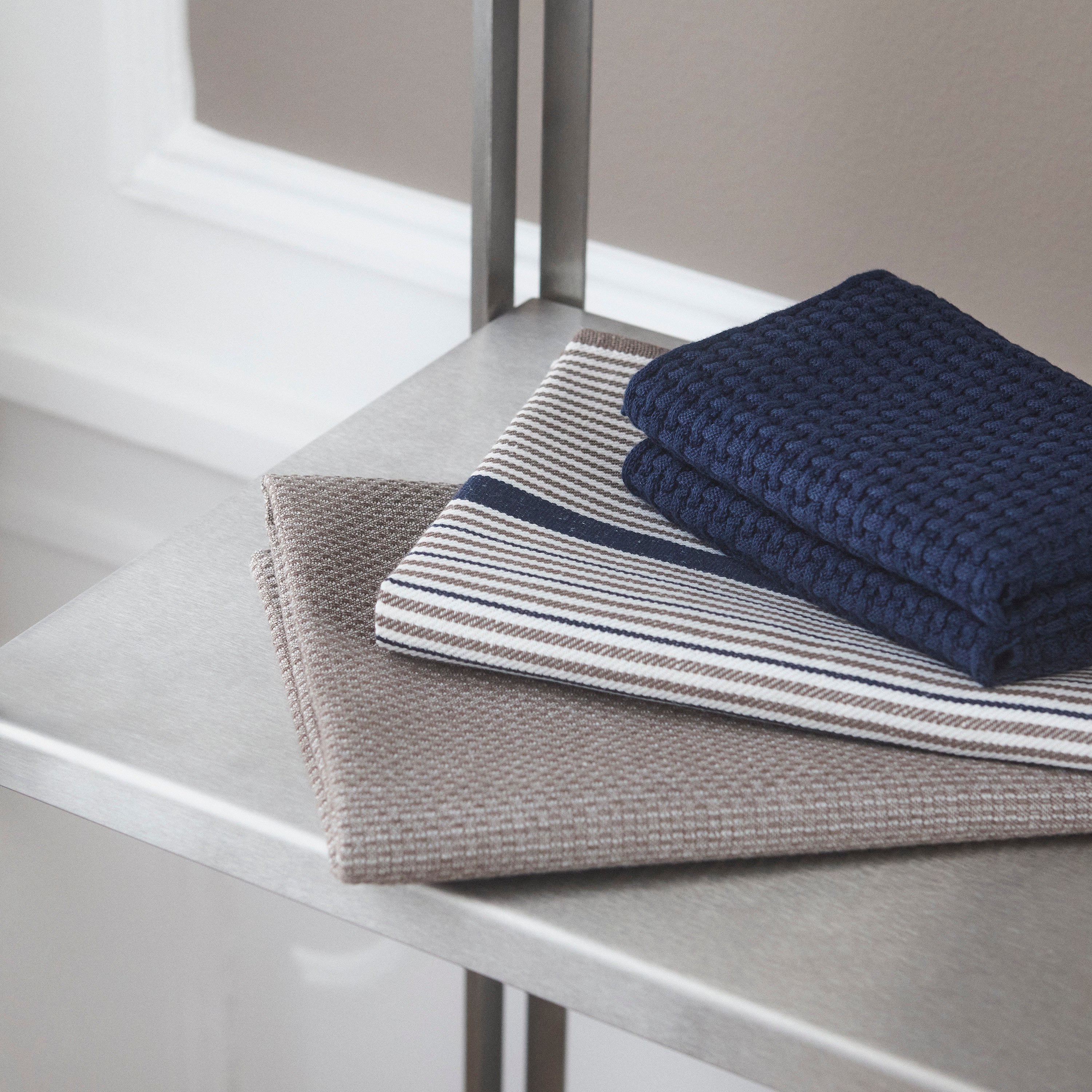 Comet viskestykket har slanke striber og er vævet i en blanding af bomuld og hør, imens 1959 køkkenhåndklædet har et helt enkelt udtryk og er vævet i 100 % bomuld. 1959 køkkenhåndklædets kraftige kvalitet gør det muligt at bruge det både som håndklæde og viskestykke. Nors karkluden er strikket i 100 % bomuld, hvilket giver den en optimal tørreevne.