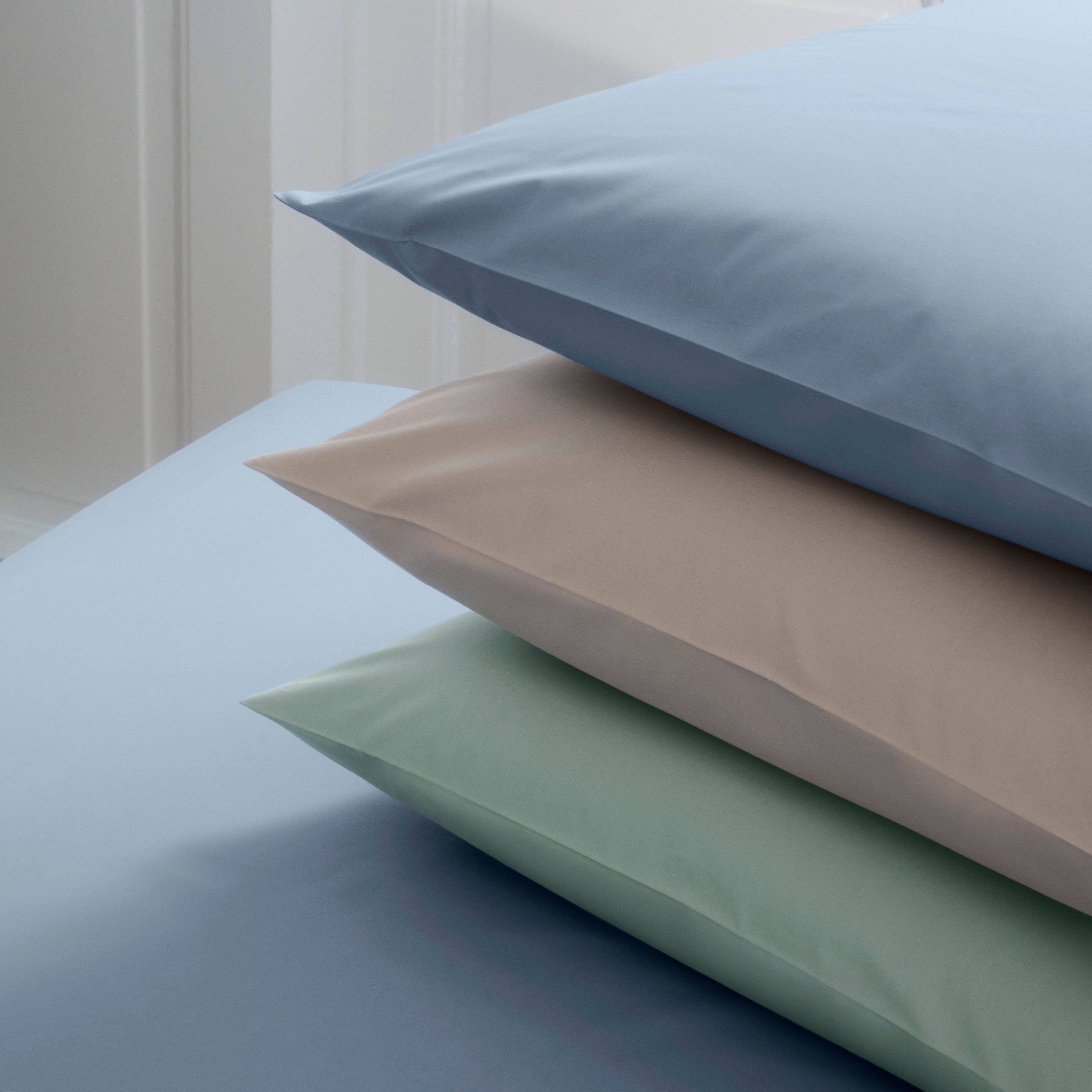 Het Supima Percale assortiment omvat alles van hoofdborden en kussens tot dekbedovertrekken en lakens in kleuren zoals lichtgrijs, lichtgroen, koel blauw en warme aardetinten. De lange vezels van katoen geven het beddengoed een bijzonder mooie en zeer uniforme kleurtint.