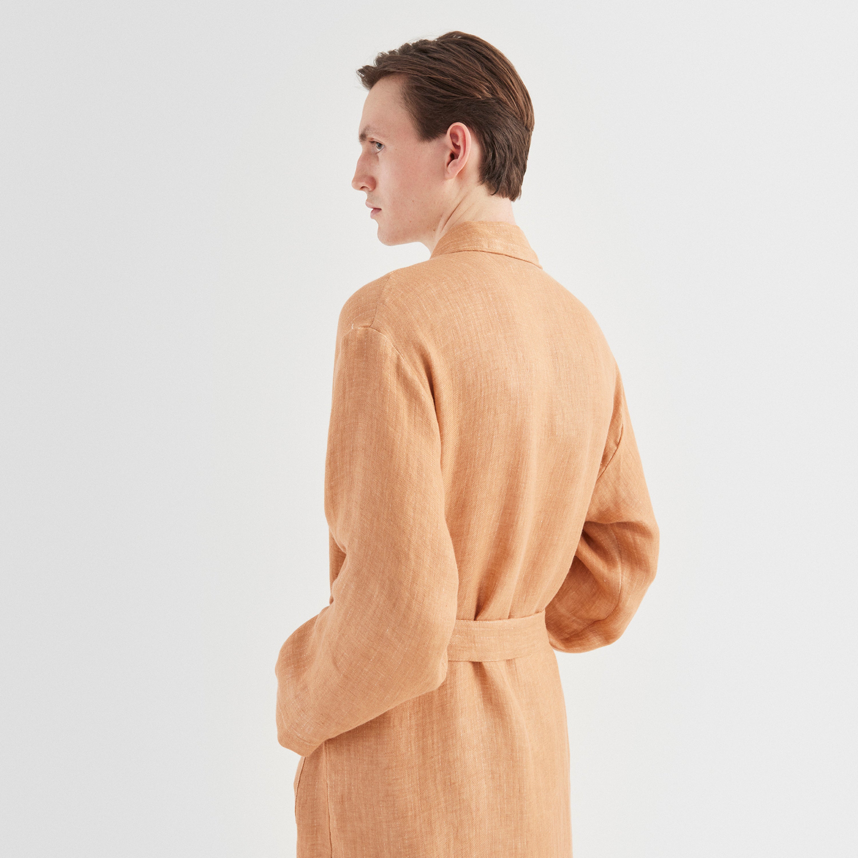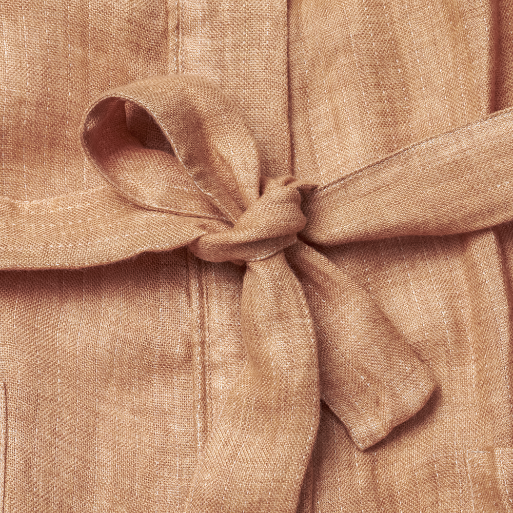 Linnen heeft een speciale plaats in de geschiedenis van Georg Jensen Damask, omdat linnen het eerste materiaal was waarmee we weefden. De linnen kimono is daarom ook een eerbetoon aan de tradities van het verleden door de keuze van het materiaal en de weinige, maar goed gekozen details.