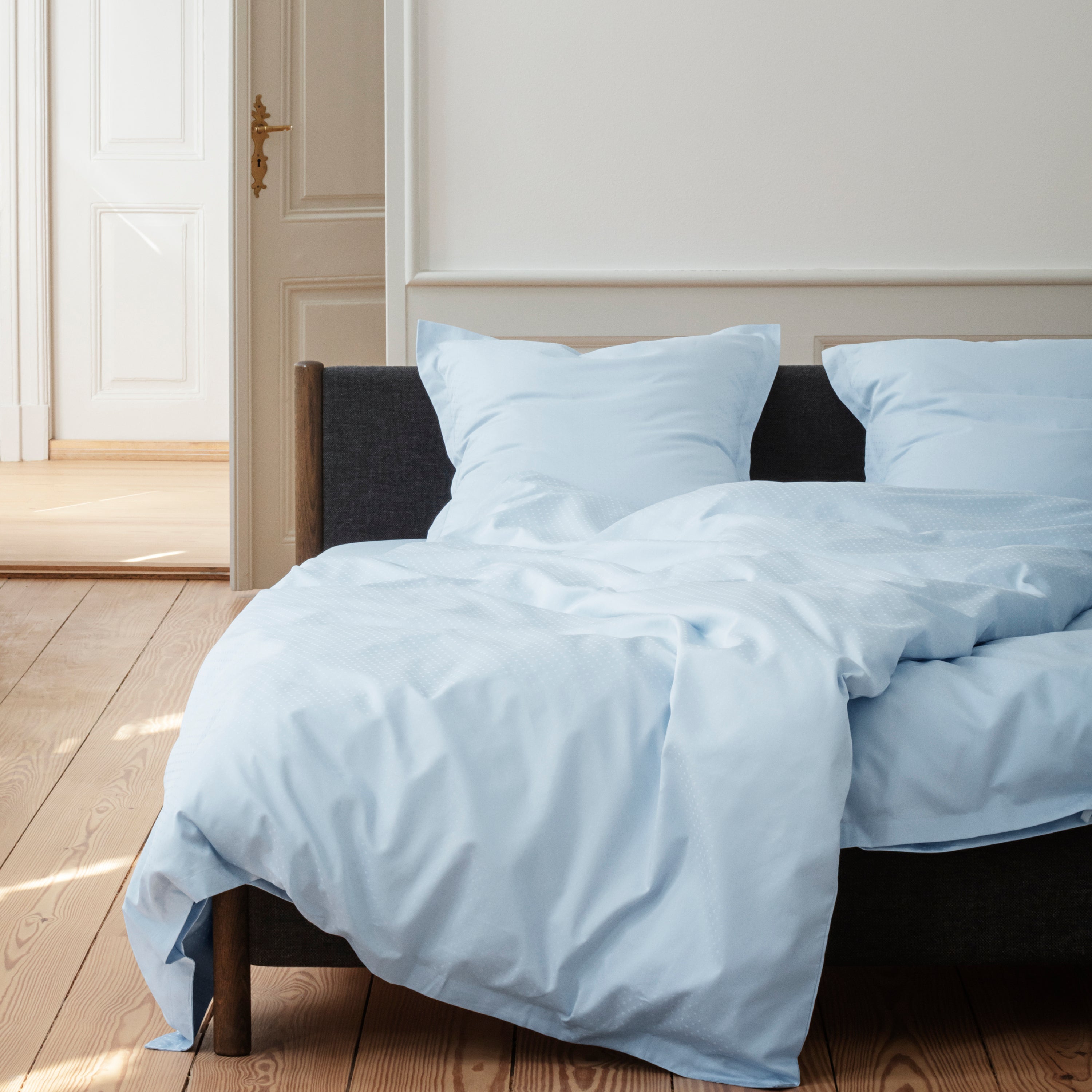 De Nordlys beddenset in de kleur Light Blue is damast geweven beddengoed van de hoogste kwaliteit, geweven van 100% dubbel getwijnd gekamd katoen. Het patroon is ontworpen door Bent Georg Jensen, die jarenlang aan de wieg stond van de ontwerpontwikkeling van Georg Jensen Damast. De kleur Light Blue is een lichtblauwe klassieker.