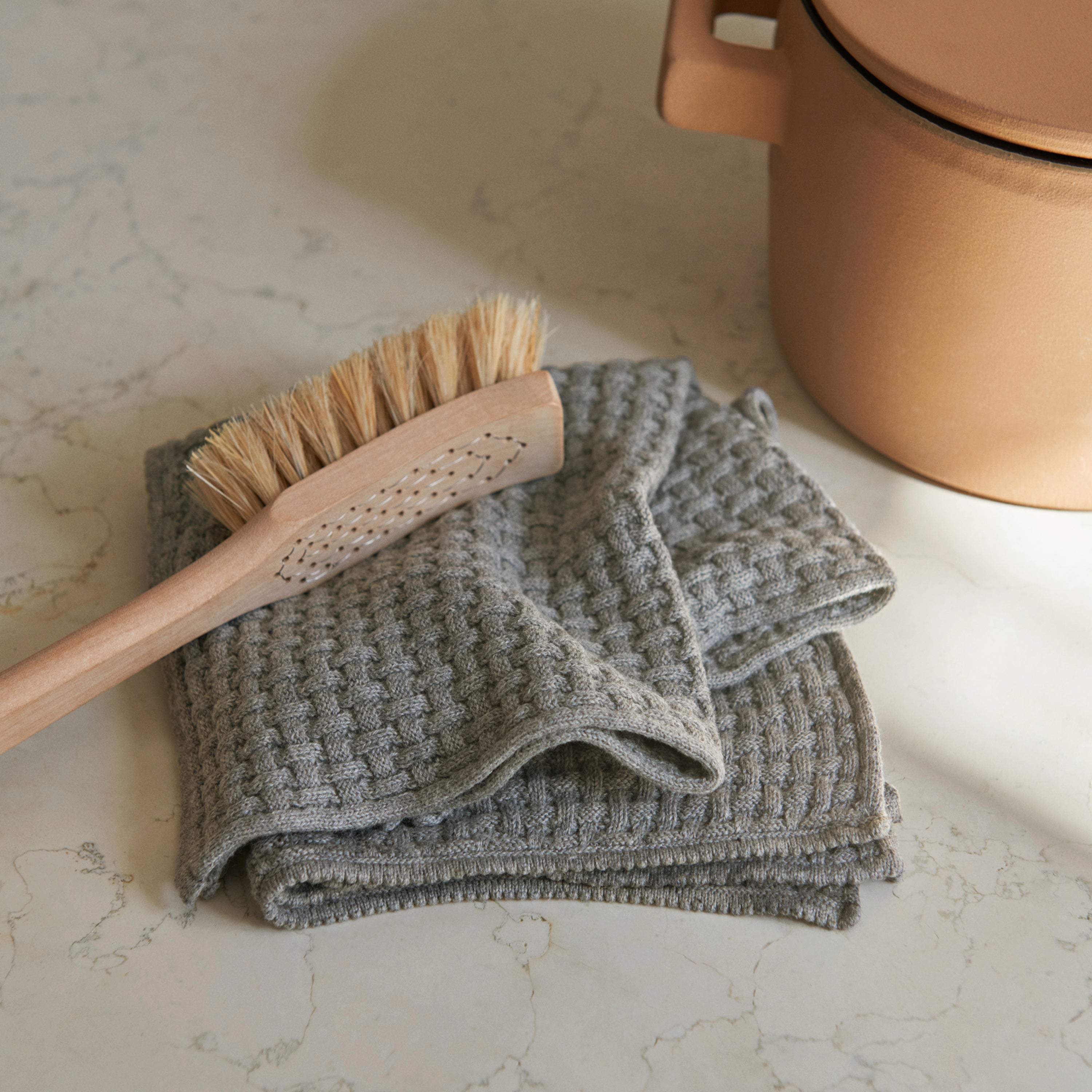Zachte en luxe vaatdoek in de fijnste katoenkwaliteit en een klassieke grijze kleur. De vaatdoek is gebreid met een speciaal gewafeld patroon dat kleine zakjes creëert voor het water, voor uitzonderlijke droogeigenschappen.