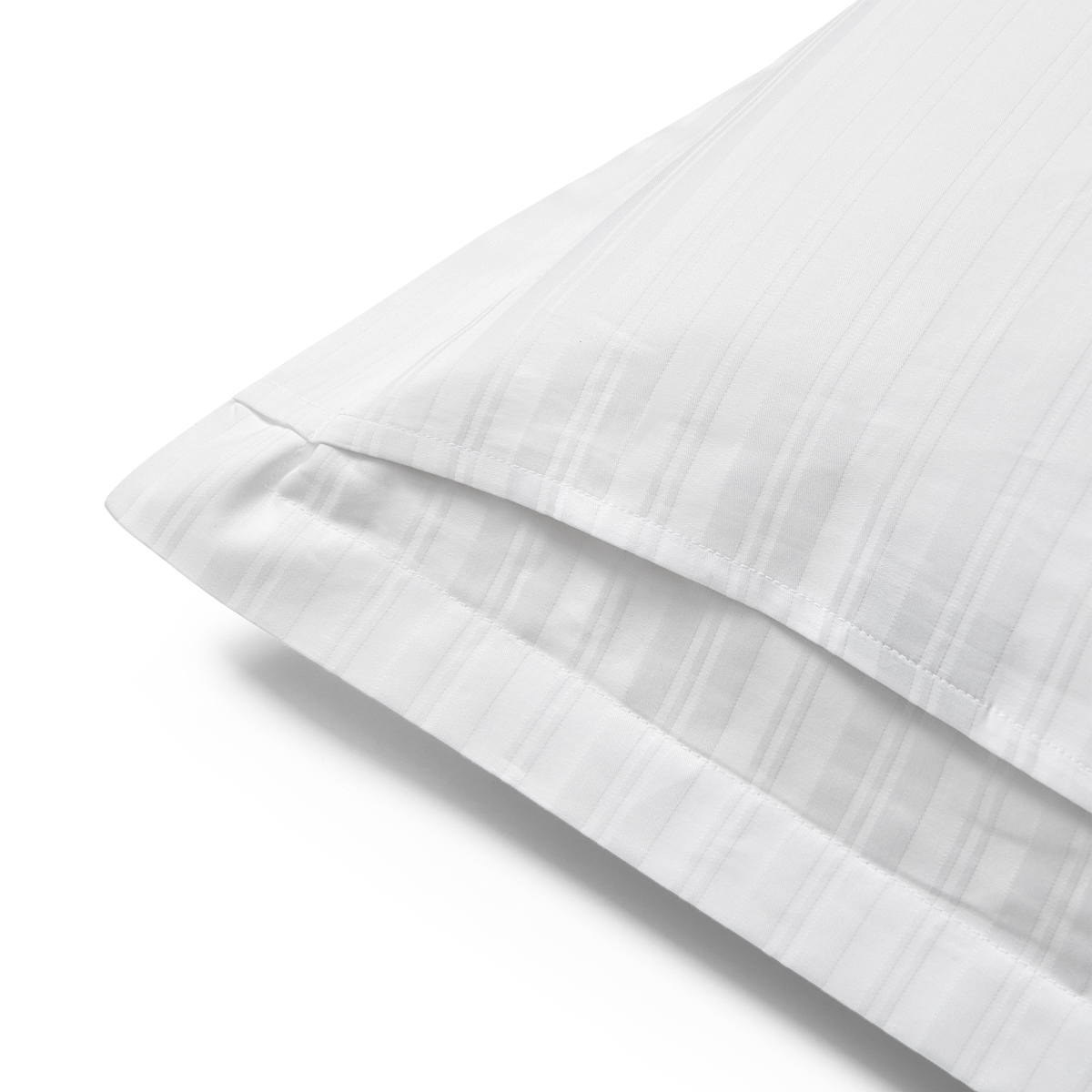 Damast geweven kussensloop in een klassiek gestreept patroon. De kussensloop sluit met een envelopsluiting.