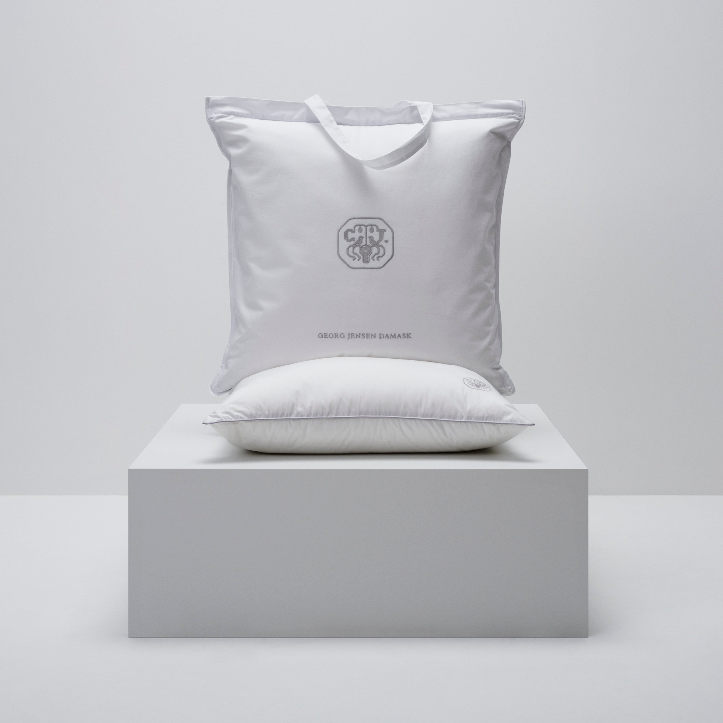 Op het kussen staat het iconische logo van Georg Jensen Damask als een discreet borduursel - een symbool van kwaliteit en zorg.