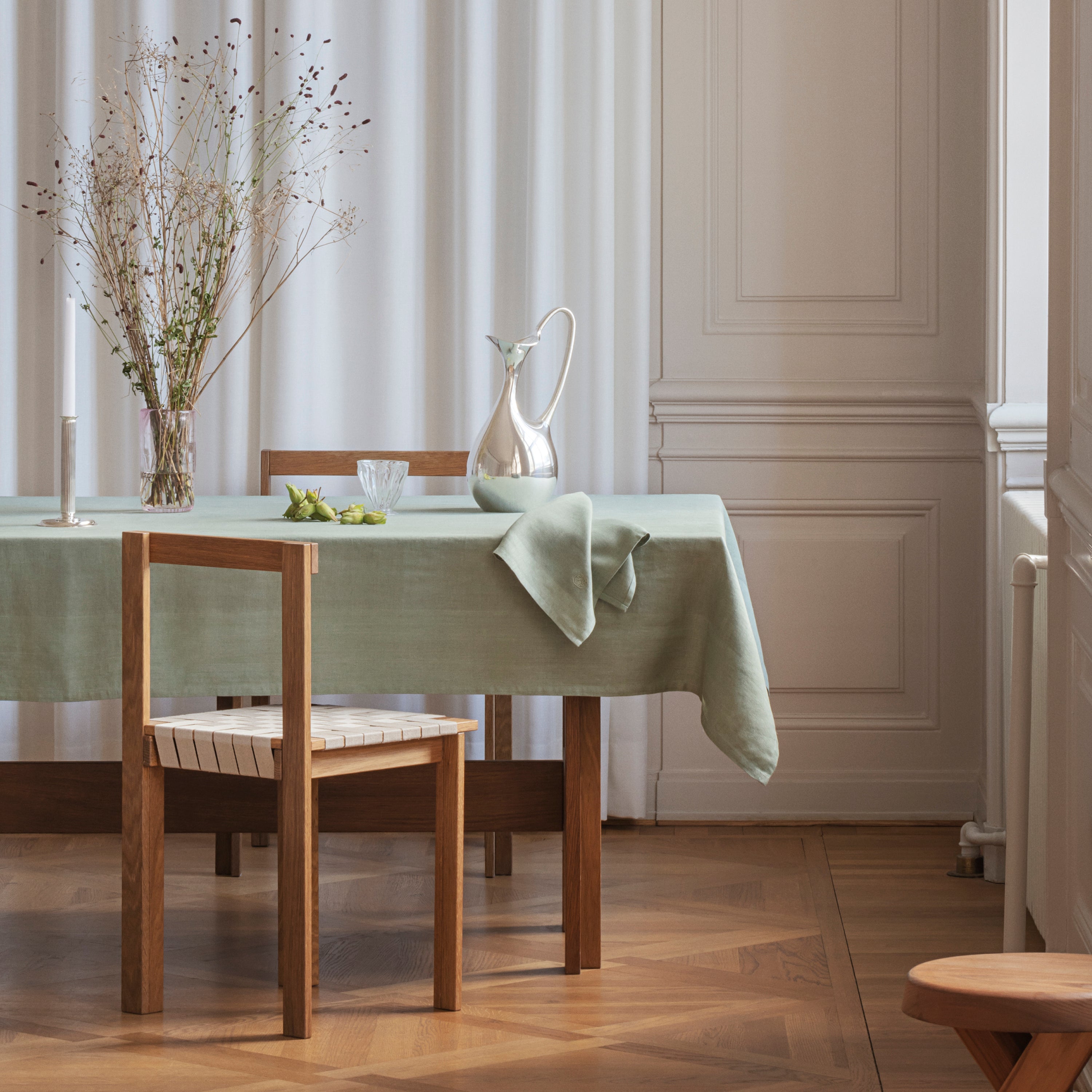 In de tint Mineral Green is het tafelkleed zo klassiek als het maar kan - en een prachtig alternatief voor onze damast geweven katoenen tafelkleden.