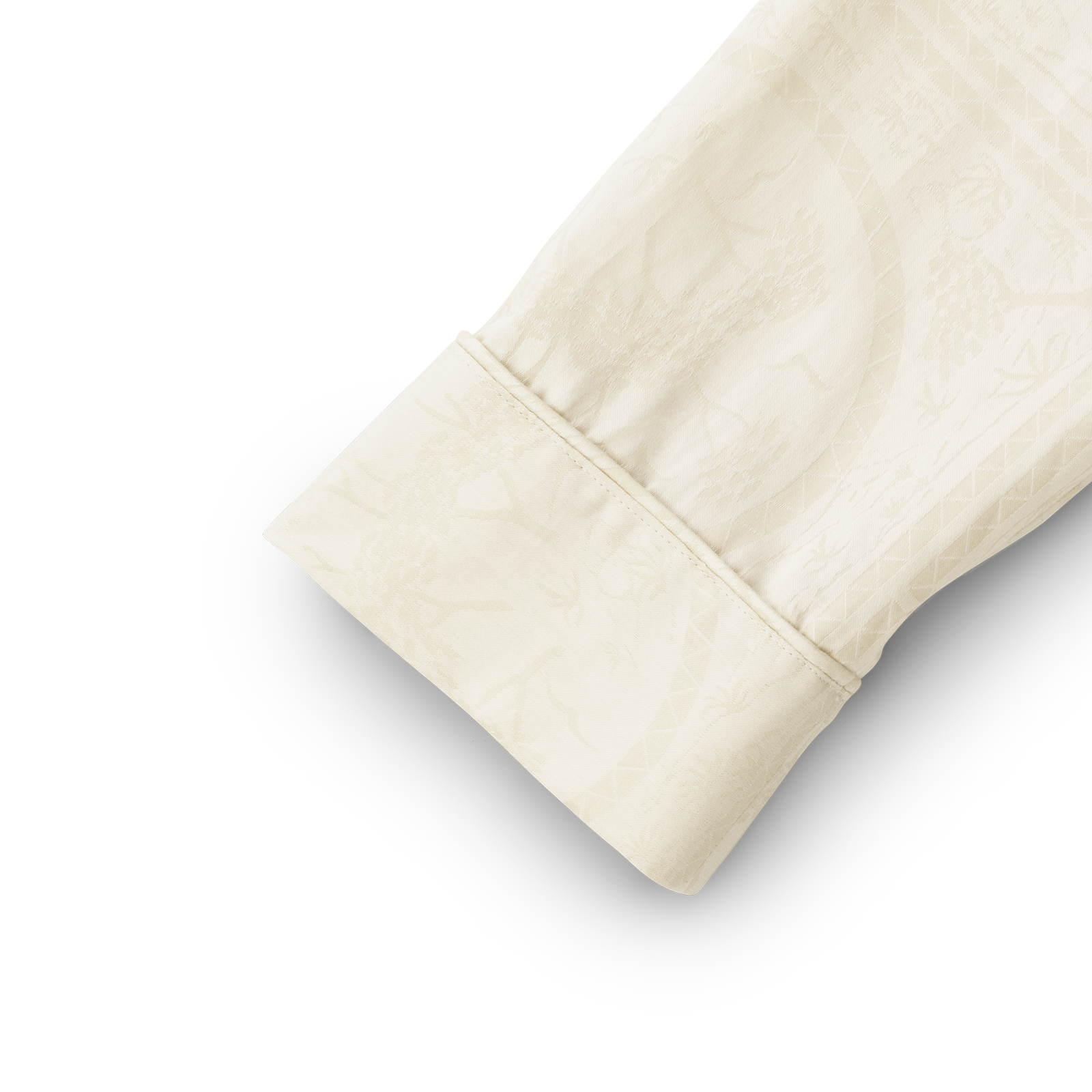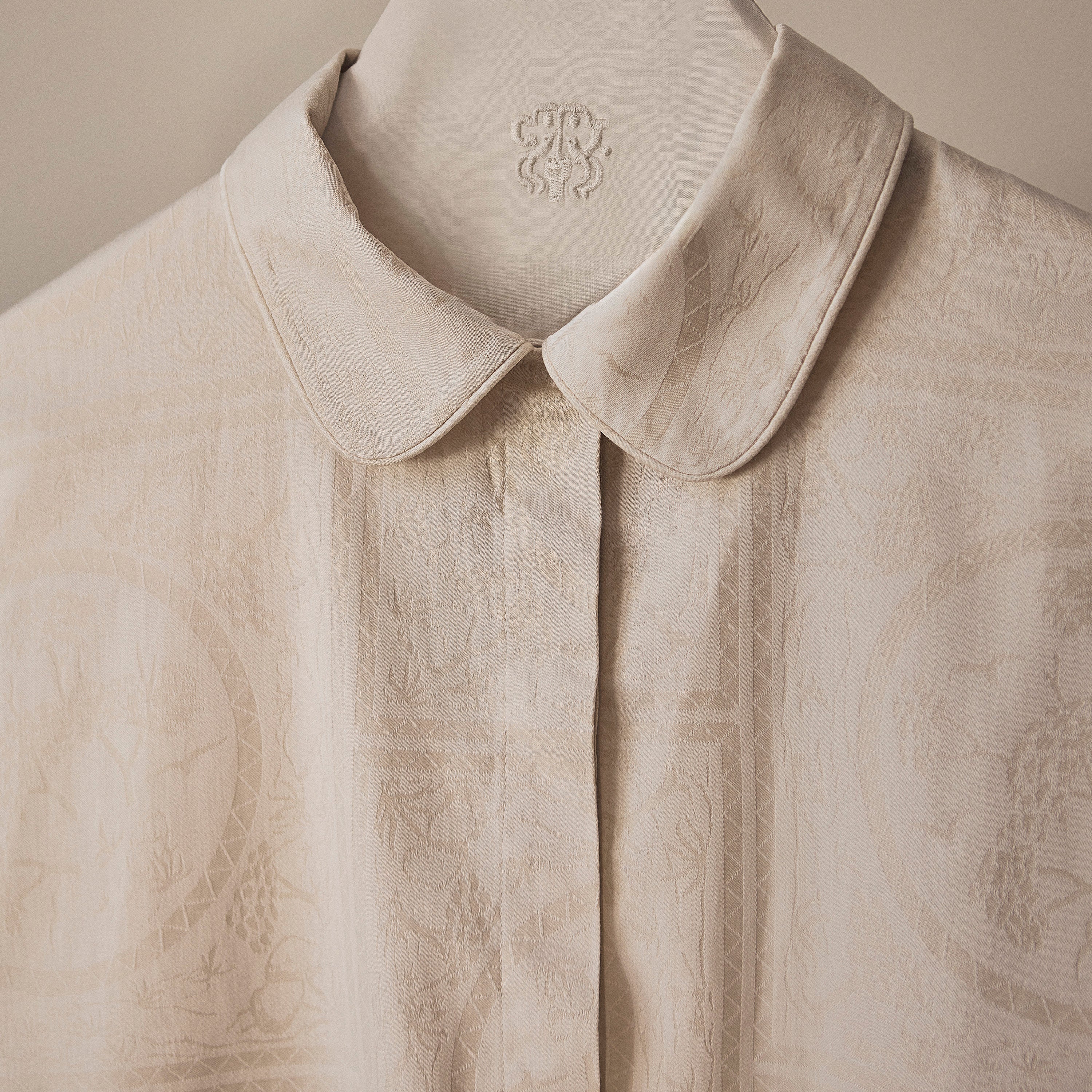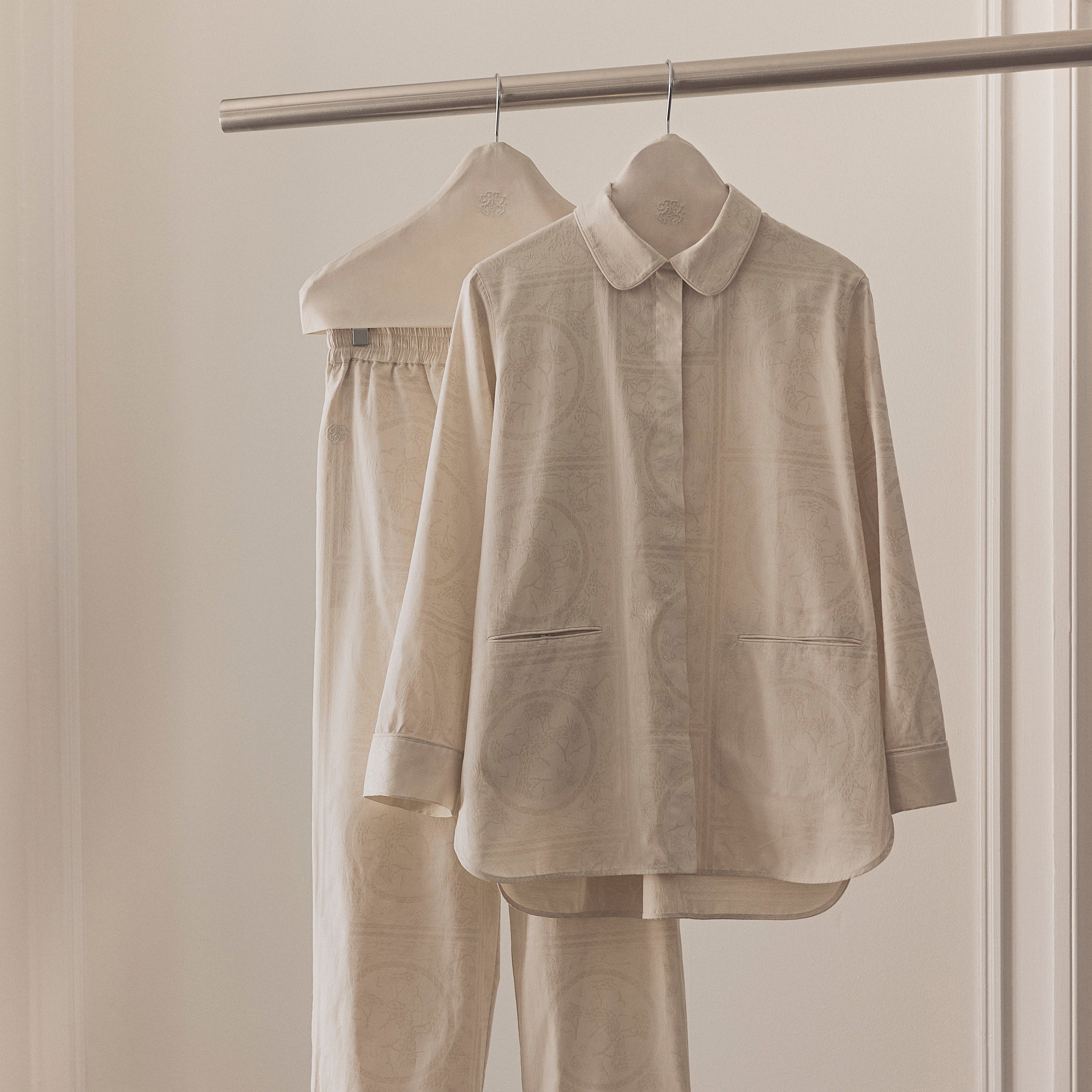 Scenery pyjamassen er jacquardvævet i bomuldssatin med et historisk mønster fra Georg Jensen Damasks omfattende designarkiv. Det originale jagtmønster blev brugt på en dug i 1800-tallet og i 1933 videreudvikledes mønsteret til en serviet af Julie Marstrand.