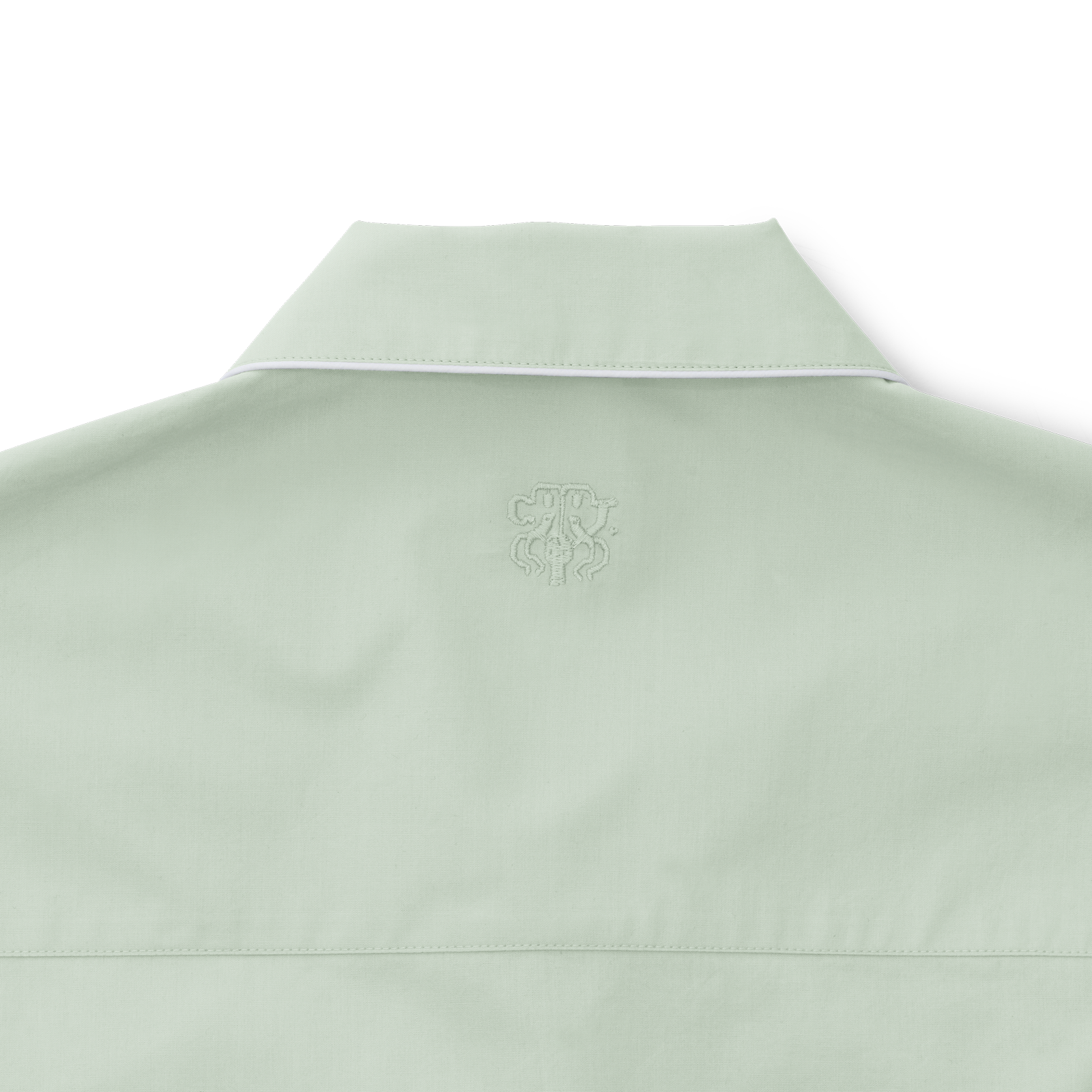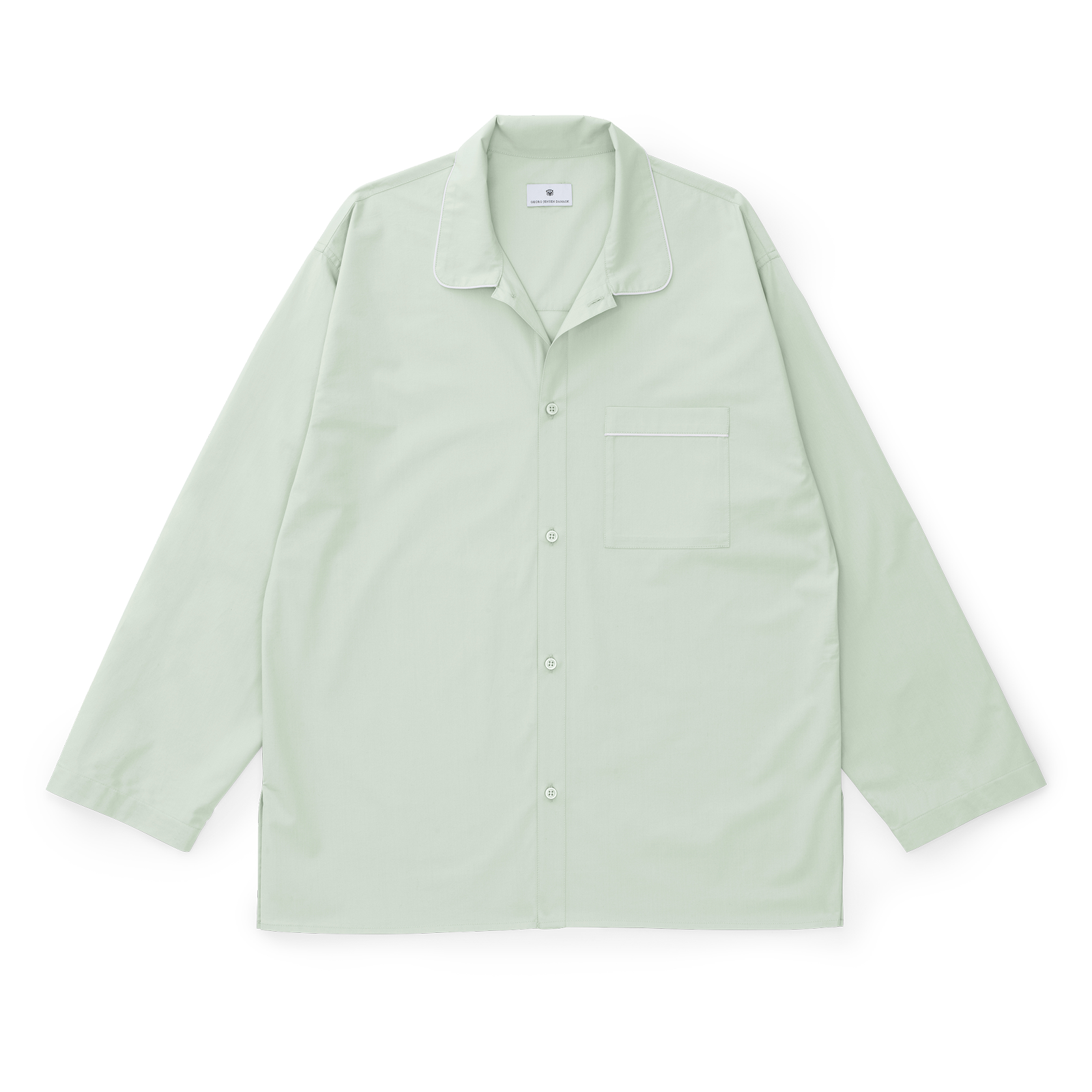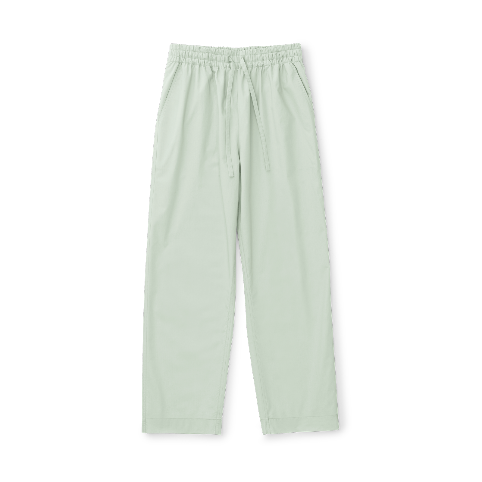 Unisex pyjamas percalevævet i supimabomuld. Pyjamassen har et klassisk snit og elegante, hvide pipings. Den klare, grønblå farve, Glass Green, er inspireret af farven på råglas.